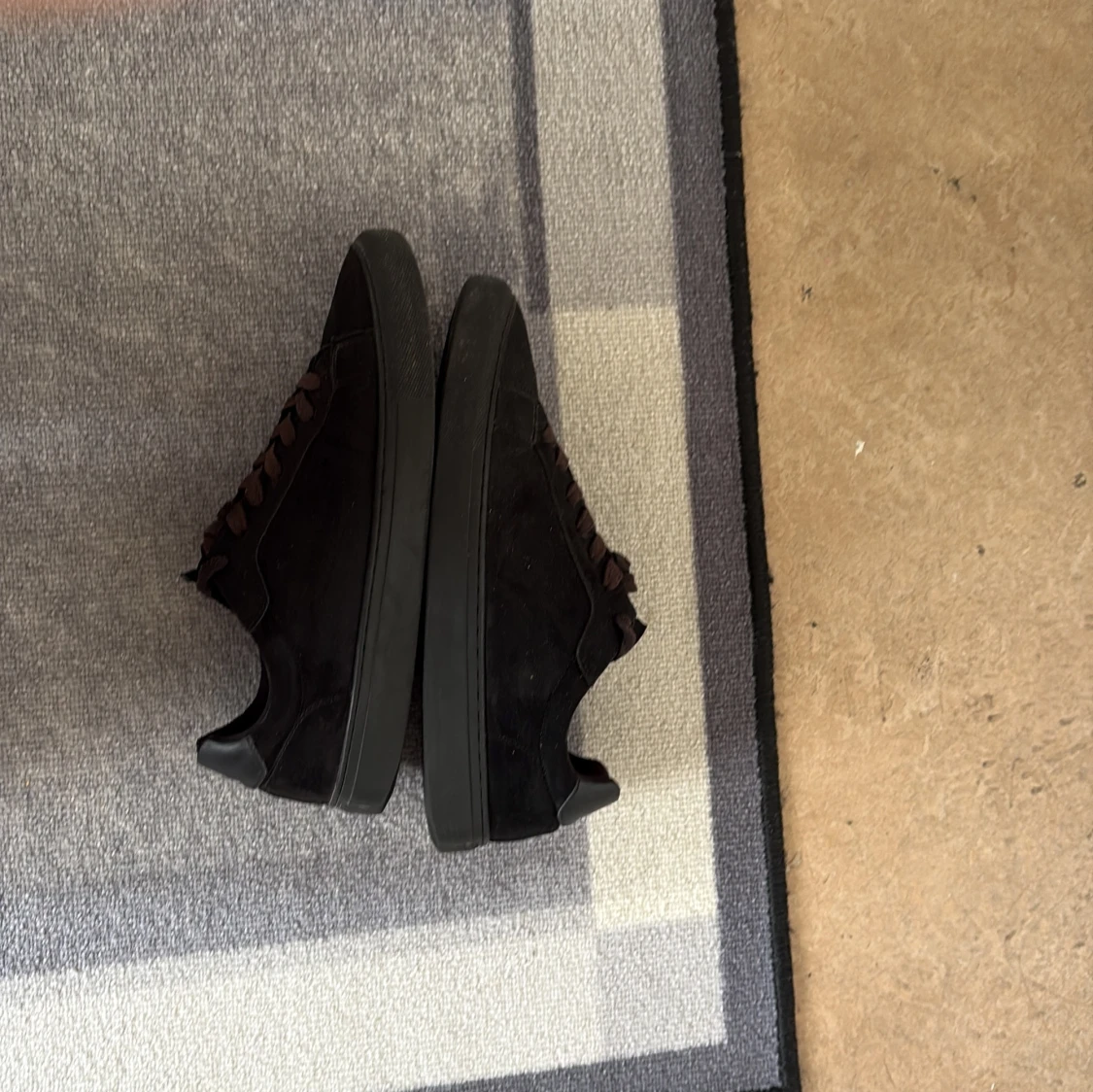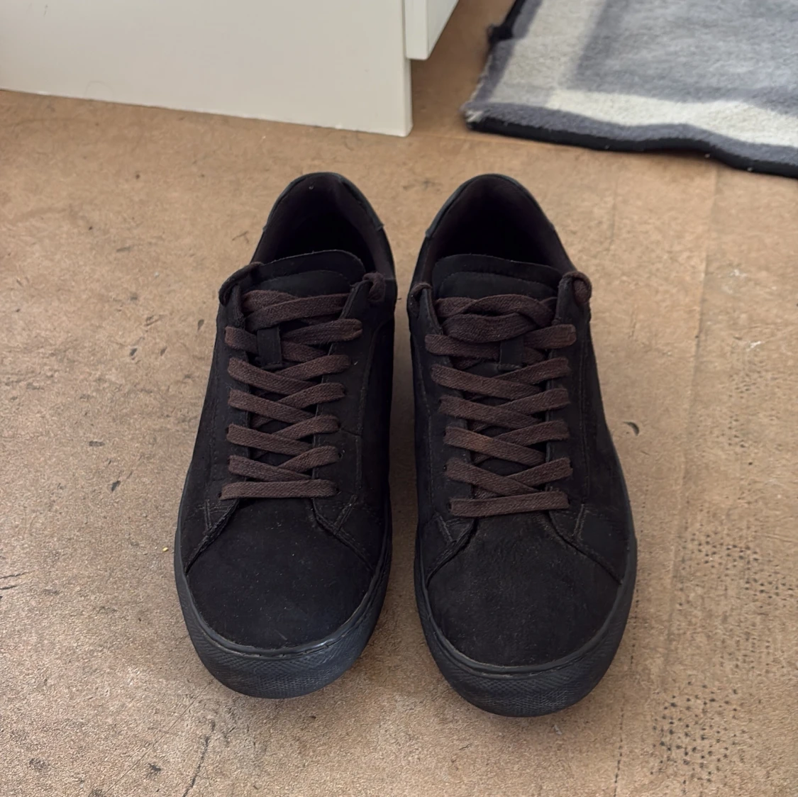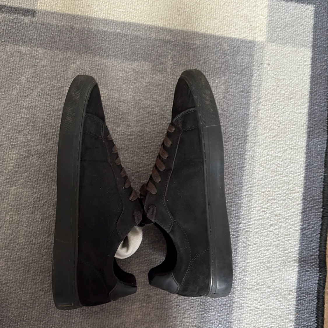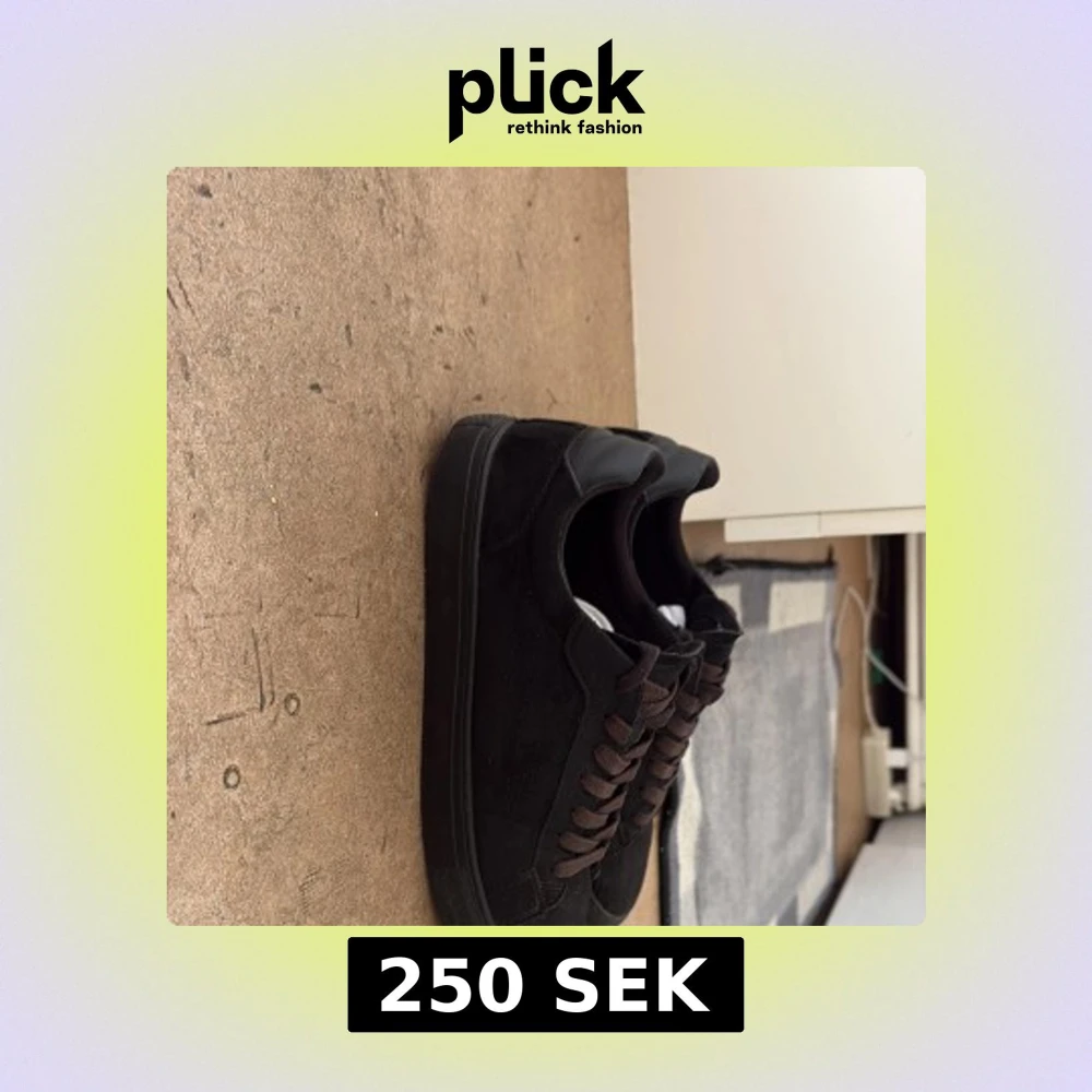 Säljer ett par stilrena svarta sneakers med ovandel i mocka och detaljer i skinn. Skorna har svarta snören egntiligen men är lite smutsiga