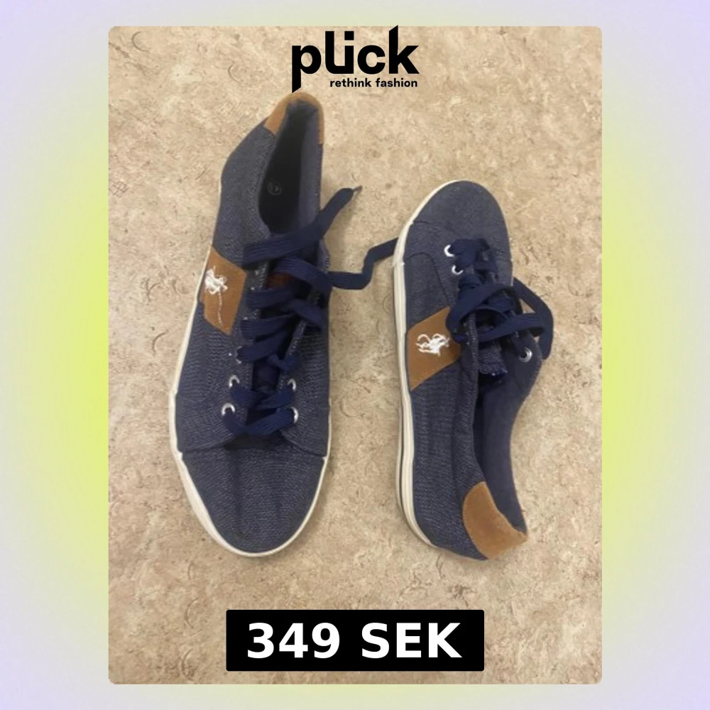 Snygga mörkblå sneakers med vita sulor och bruna mockadetaljer vid häl och sida. Skorna har snörning och en broderad vit logga på sidan. Ovandelen är i textil och ger en avslappnad men stilren look.