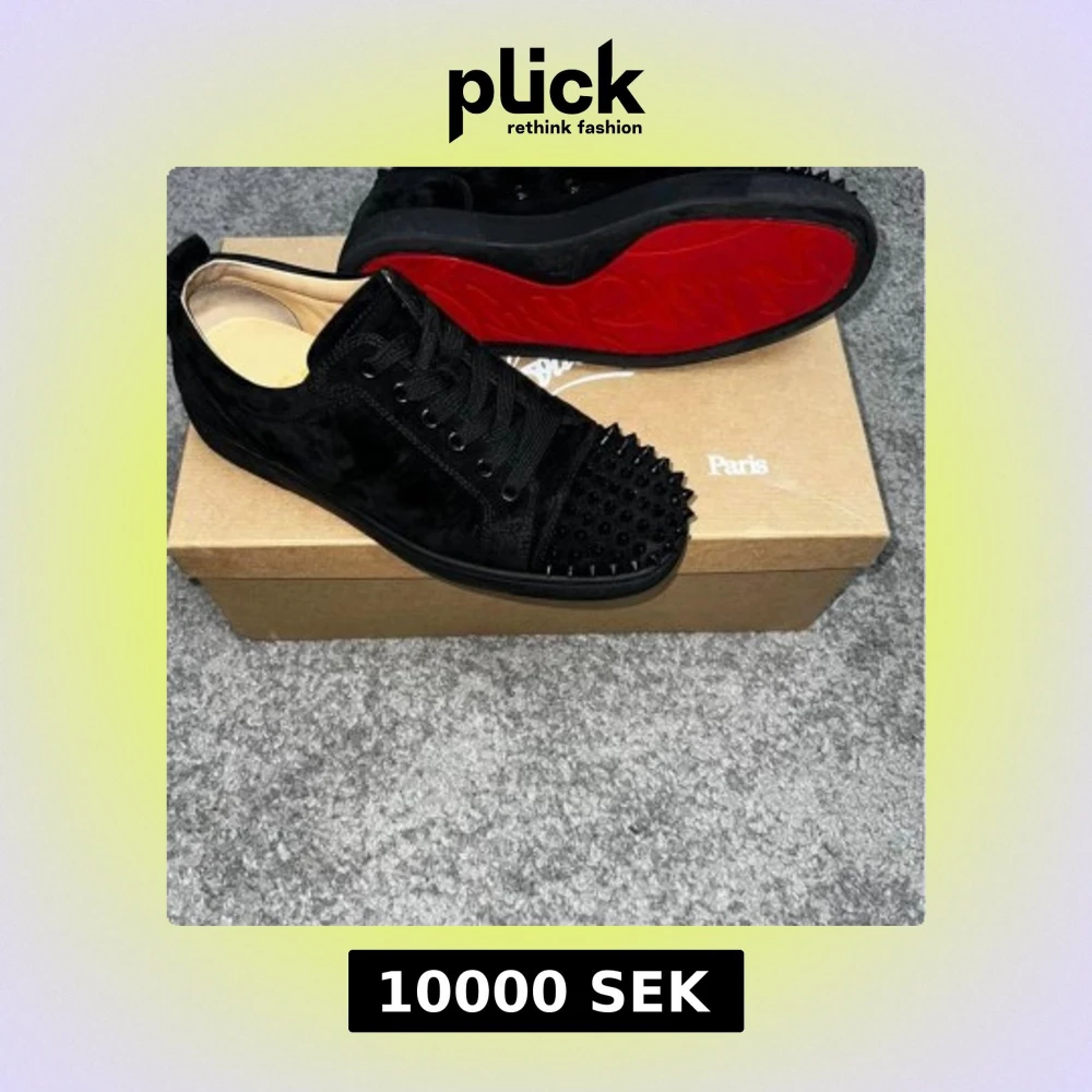 Säljer ett par svarta sneakers med coola nitar på tån och klassisk röd sula. Skorna har snörning och är tillverkade i mocka med platt sula. Perfekta för dig som vill sticka ut med din stil.