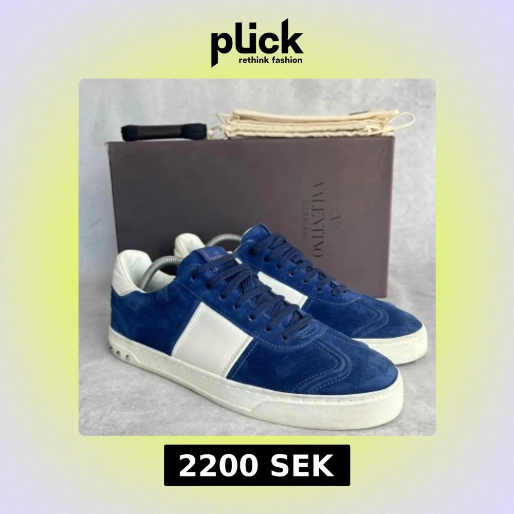 Säljer ett par snygga Valentino Garavani sneakers i blå mocka med vita detaljer och vit sula. Skorna har rund tå, snörning och ikoniska nitar på hälen. Perfekta för dig som vill ha något unikt och stilrent, storlek 43