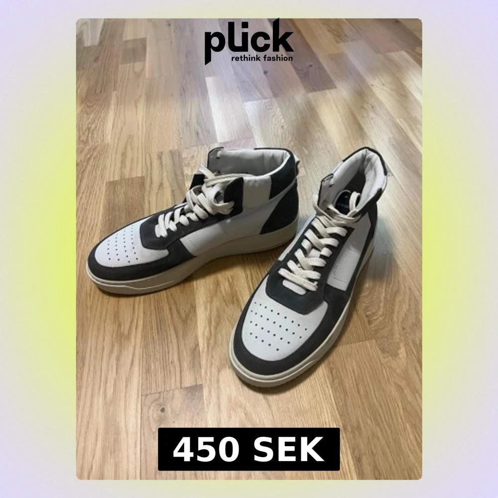 Hi-top sneakers från JUNK de LUXE. Skornas ovandelar är gjorda av mocka med vit gummisula. Logotypdetaljer finns på sidan och på skoplösen, samt perforerade detaljer upptill. Kvalitet: 100% Mocka. Skorna är helt nya med prislappen på. Storlek 43, 290mm inuti