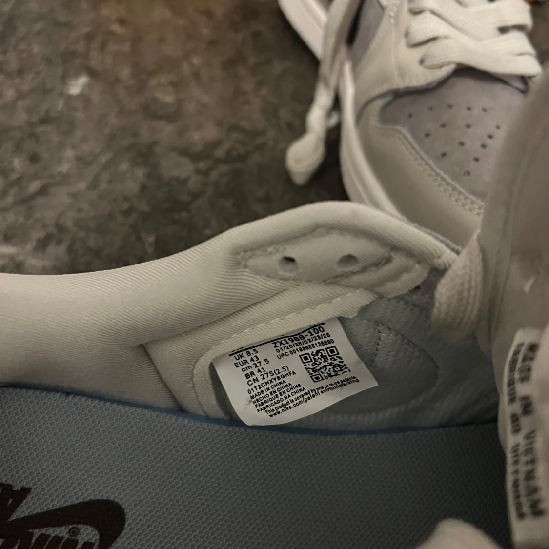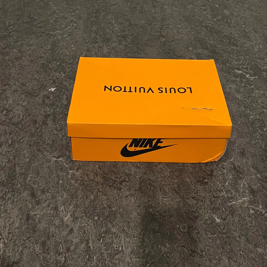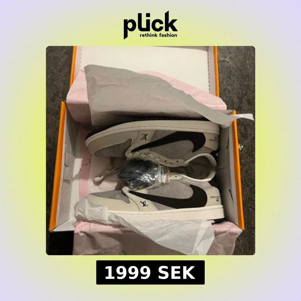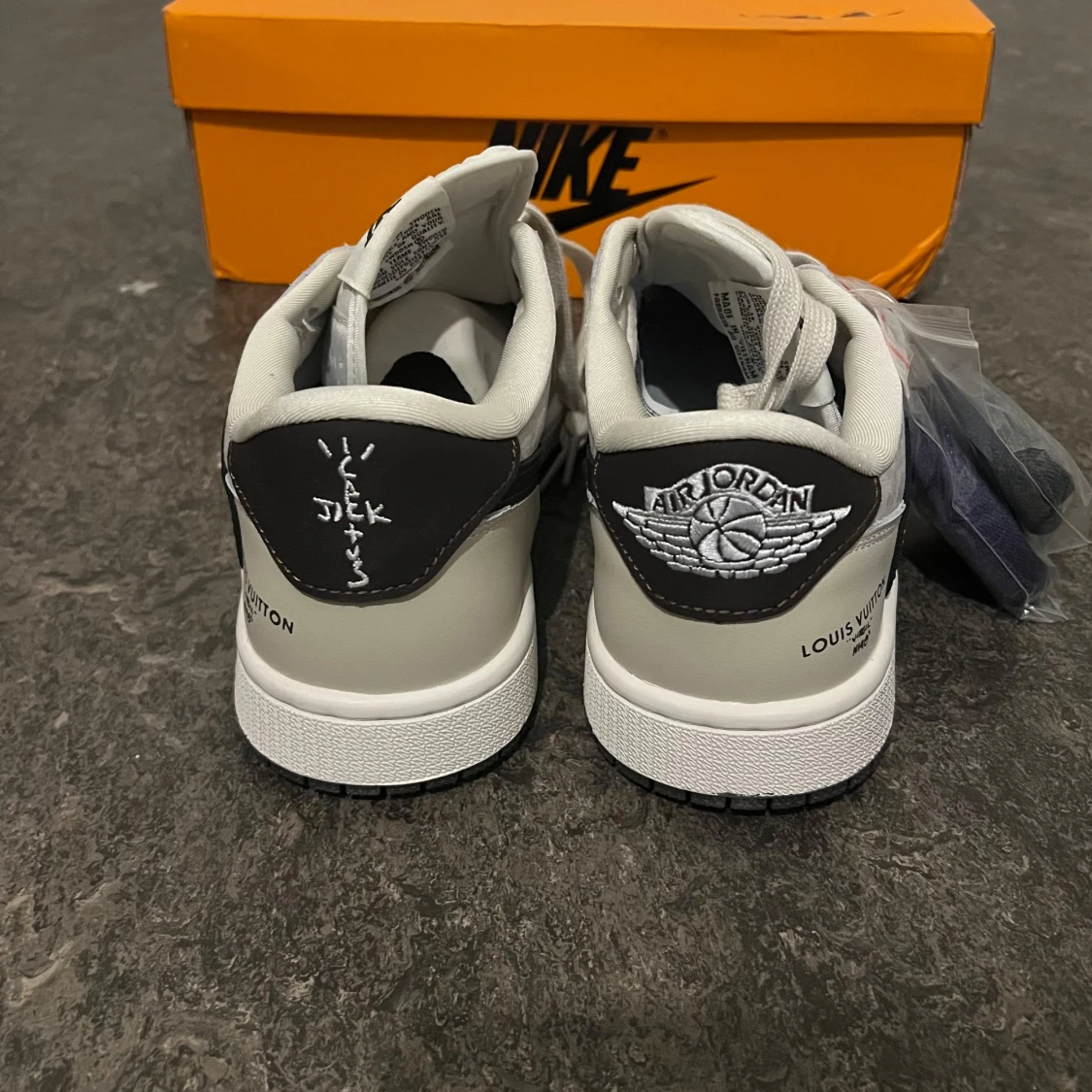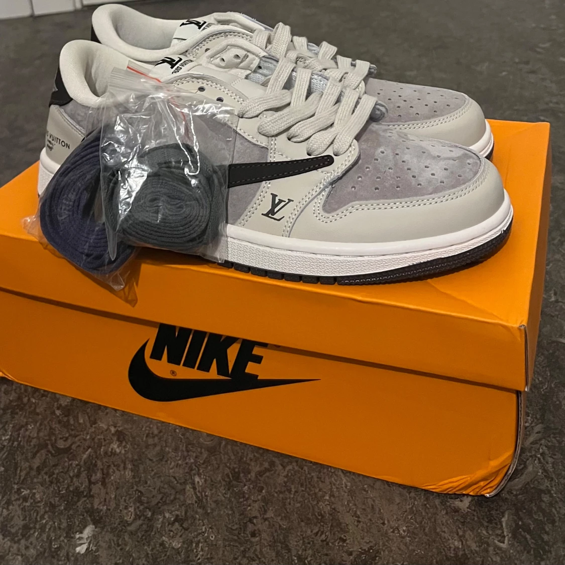 Unika sneakers med Nike Air Jordan och Louis Vuitton branding. Skorna har en snygg kombination av grå mocka och vita skinnpaneler, svart swoosh och detaljer på hälen. Rund tå, platt sula och snörning. Kommer med extra skosnören och cool orange box.
