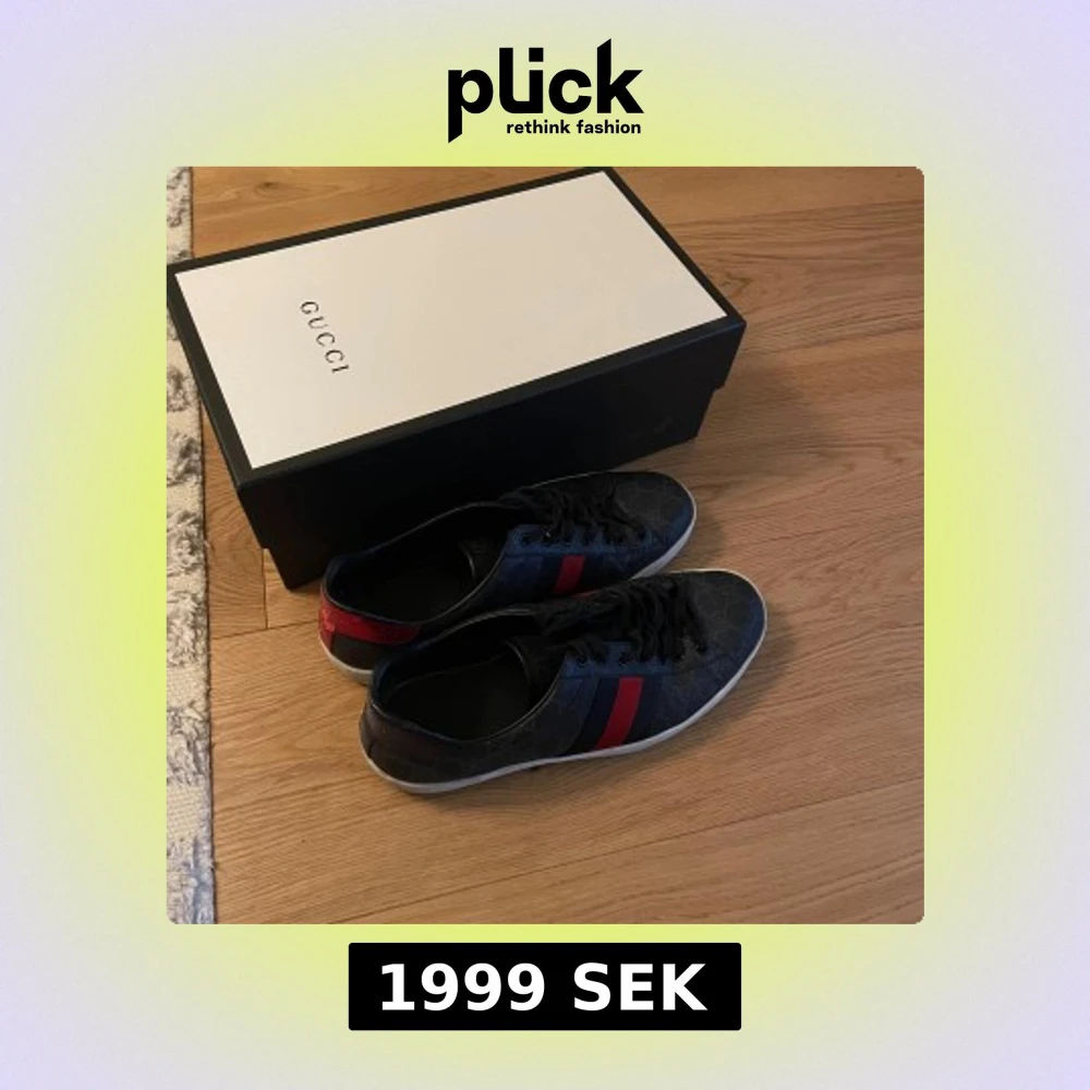 Tjenare! Säljer dessa fina Gucci ace i uk 9 (passar 43 ish) dustbag och box medföljer. Fint skick, liten reva på baksidan av ena sko (se bild) Är öppen för både byten och pengar🙏