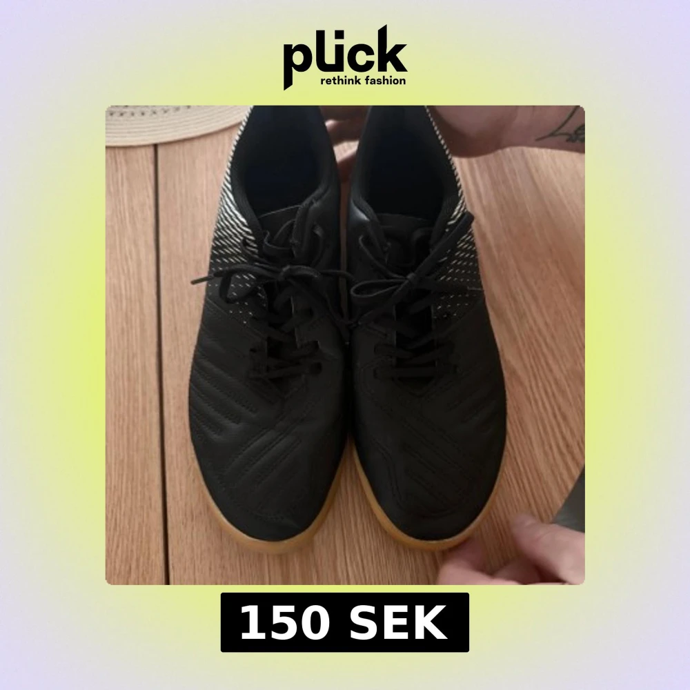 Säljer ett par svarta inomhusfotbollsskor med coolt vitt mönster på hälen och klassisk gummisula. Skorna har snörning och är tillverkade i syntetmaterial, perfekta för snabba vändningar på planen.