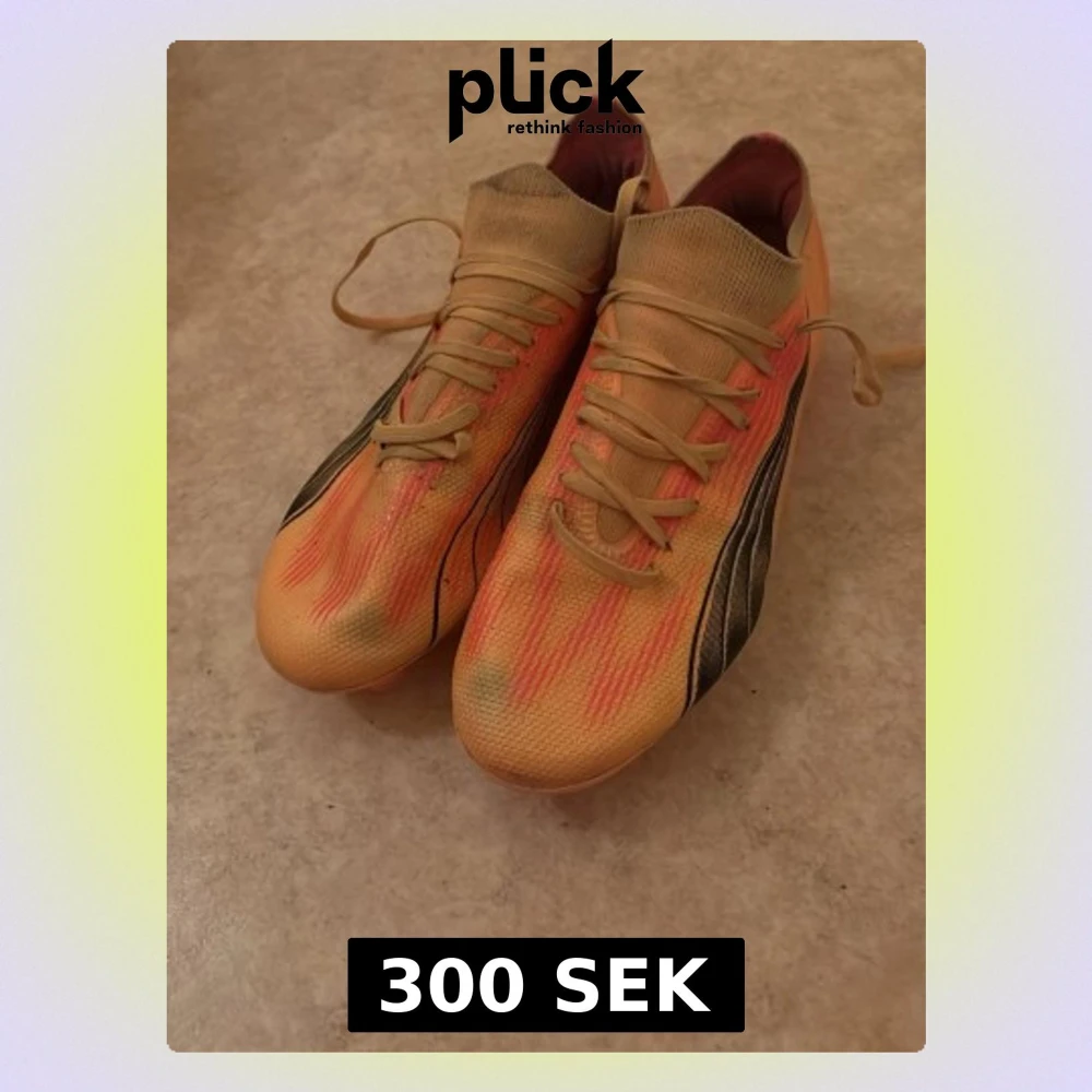 Säljer ett par riktigt snygga fotbollsskor i orange och rosa med svarta detaljer. Skorna har snörning och en ovandel i syntetmaterial som formar sig efter foten. Sulan är rosa med fasta dobbar för bra grepp på planen. Perfekta för dig som vill sticka ut på matchen!