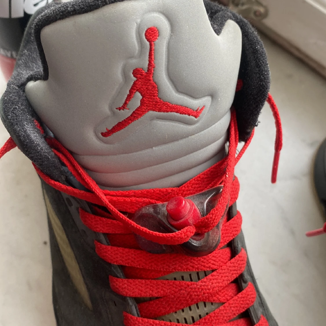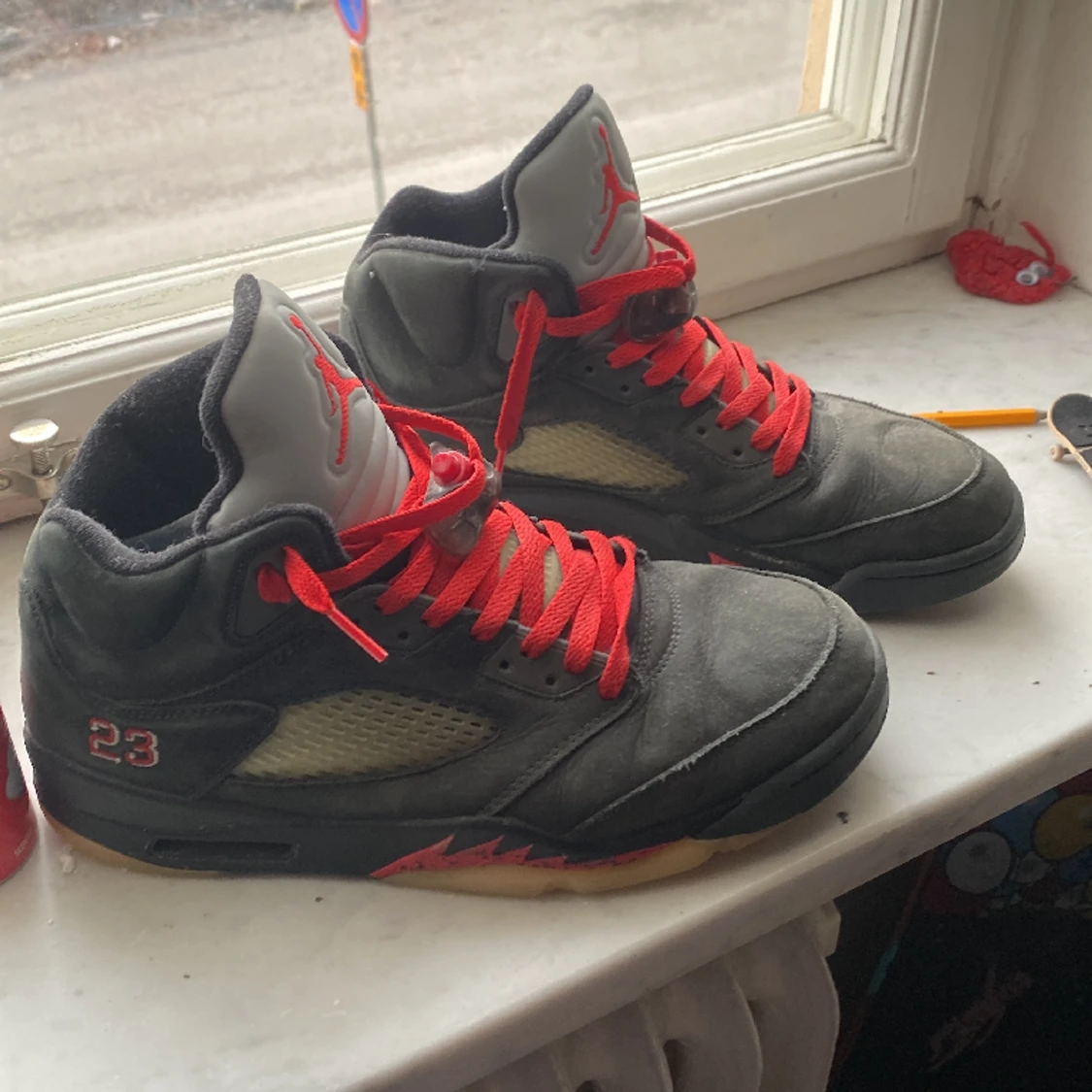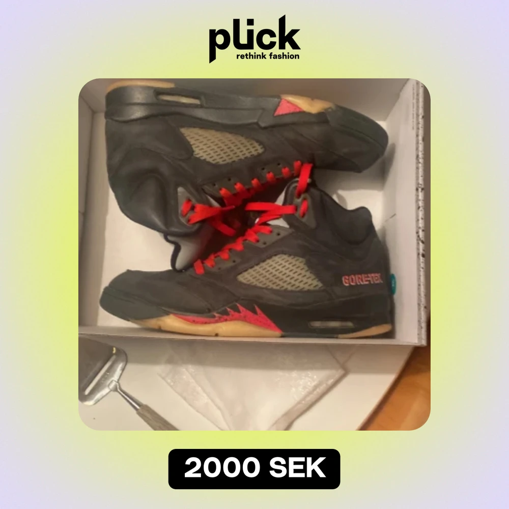 Nypris 3500-4000 Bra skick inga märkbara skador Använda ett fåtal gånger Äkta köpta från sneakers n stuff för 1 år sedan Knappt smutsiga alls Storlek 45 men passar 43 mkt bättre Boxen har små skador/små färgfläckar Kommer med svarta snören ochså