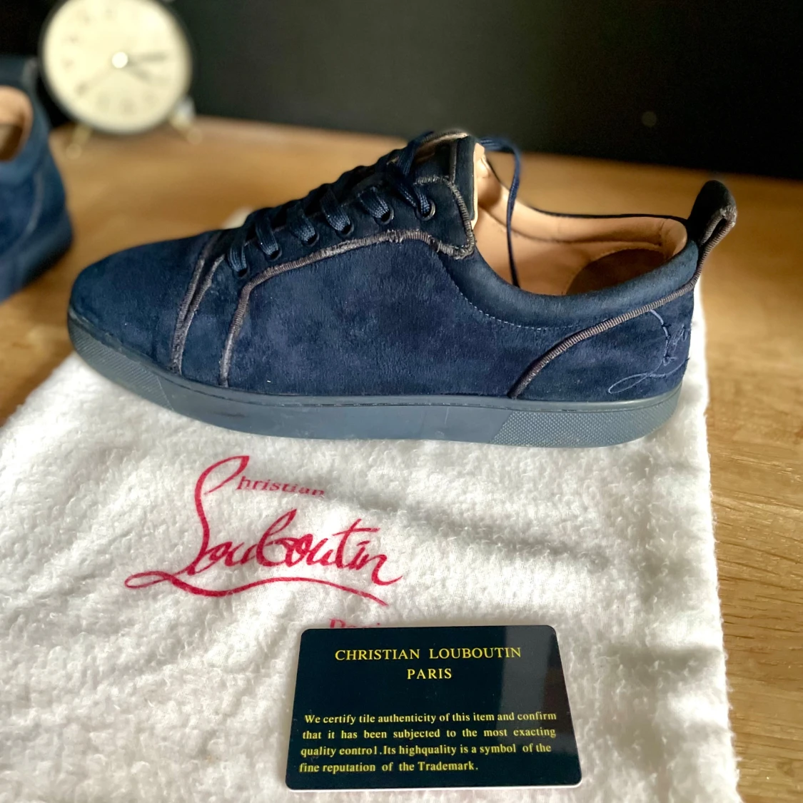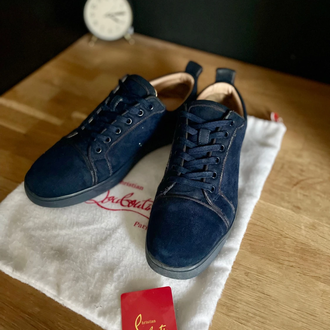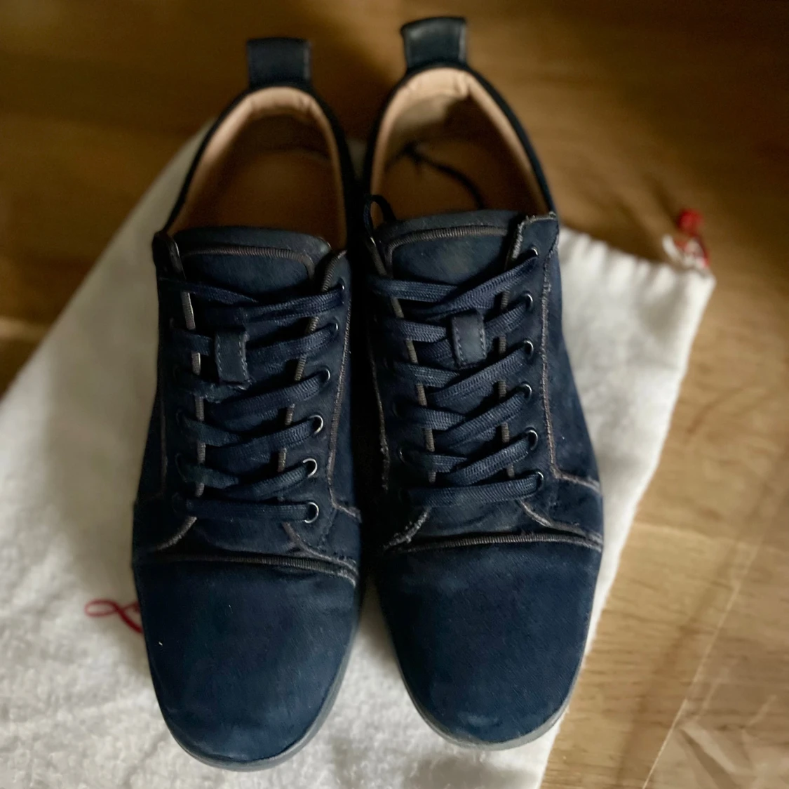 Snygga mörkblå sneakers från Christian Louboutin i mjuk mocka med rund tå och platt sula. Skorna har ton-i-ton snörning, diskret broderad logga på hälen och lyxig läderinsida. Perfekta för dig som gillar exklusiva och stilrena sneakers.