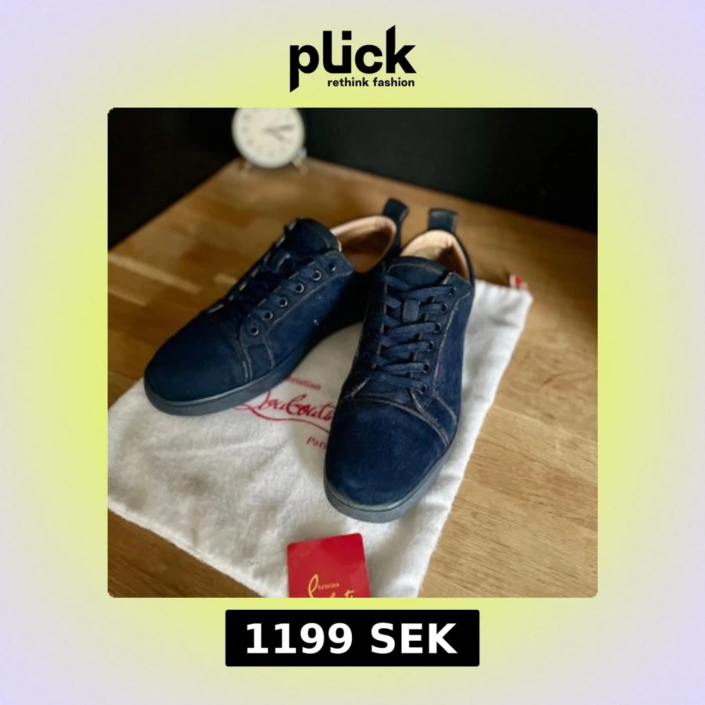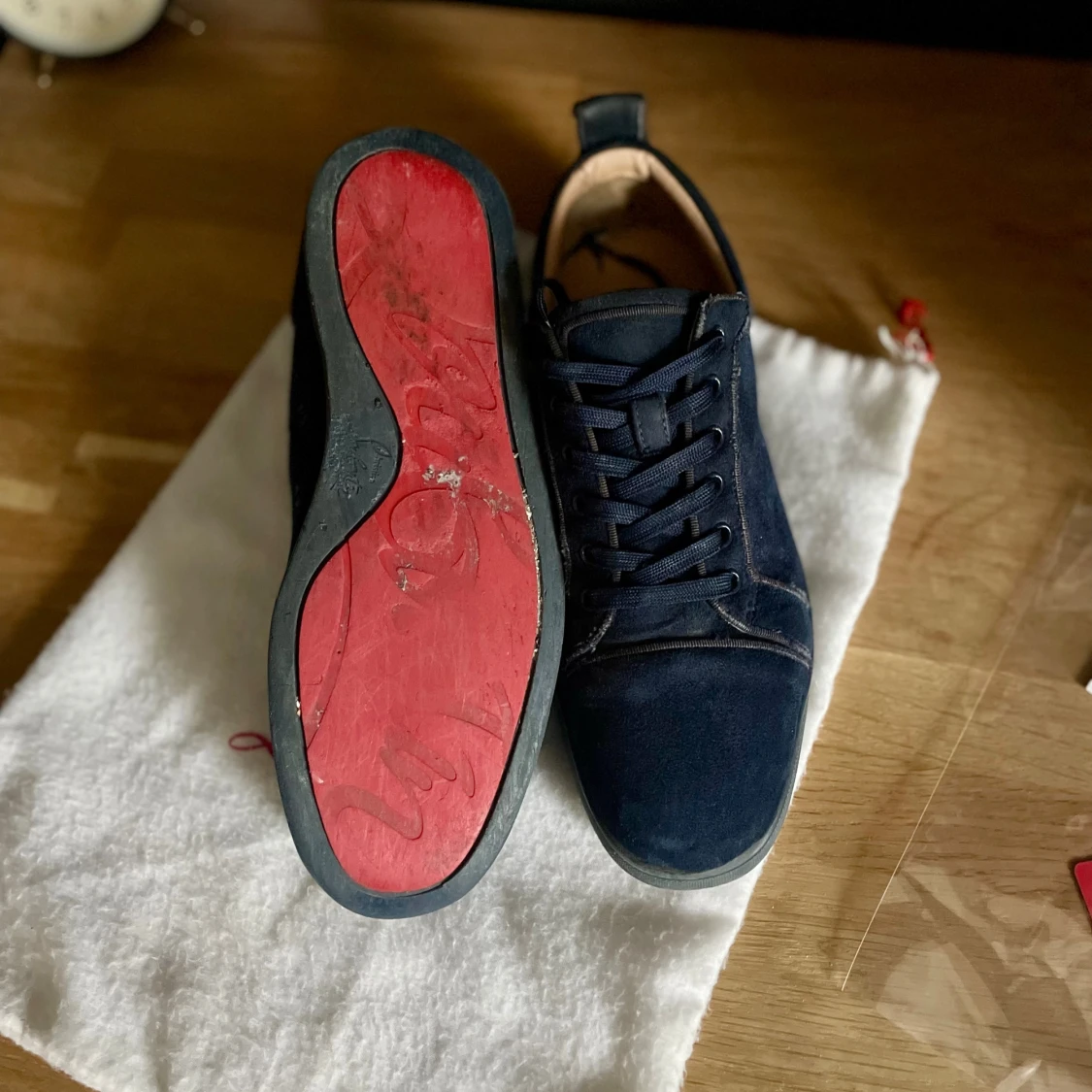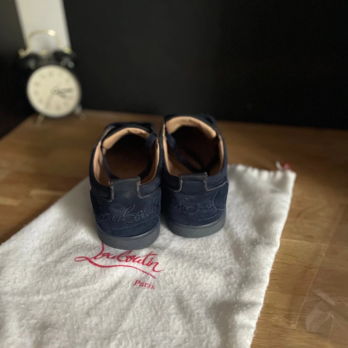 Snygga mörkblå sneakers från Christian Louboutin i mjuk mocka med rund tå och platt sula. Skorna har ton-i-ton snörning, diskret broderad logga på hälen och lyxig läderinsida. Perfekta för dig som gillar exklusiva och stilrena sneakers.