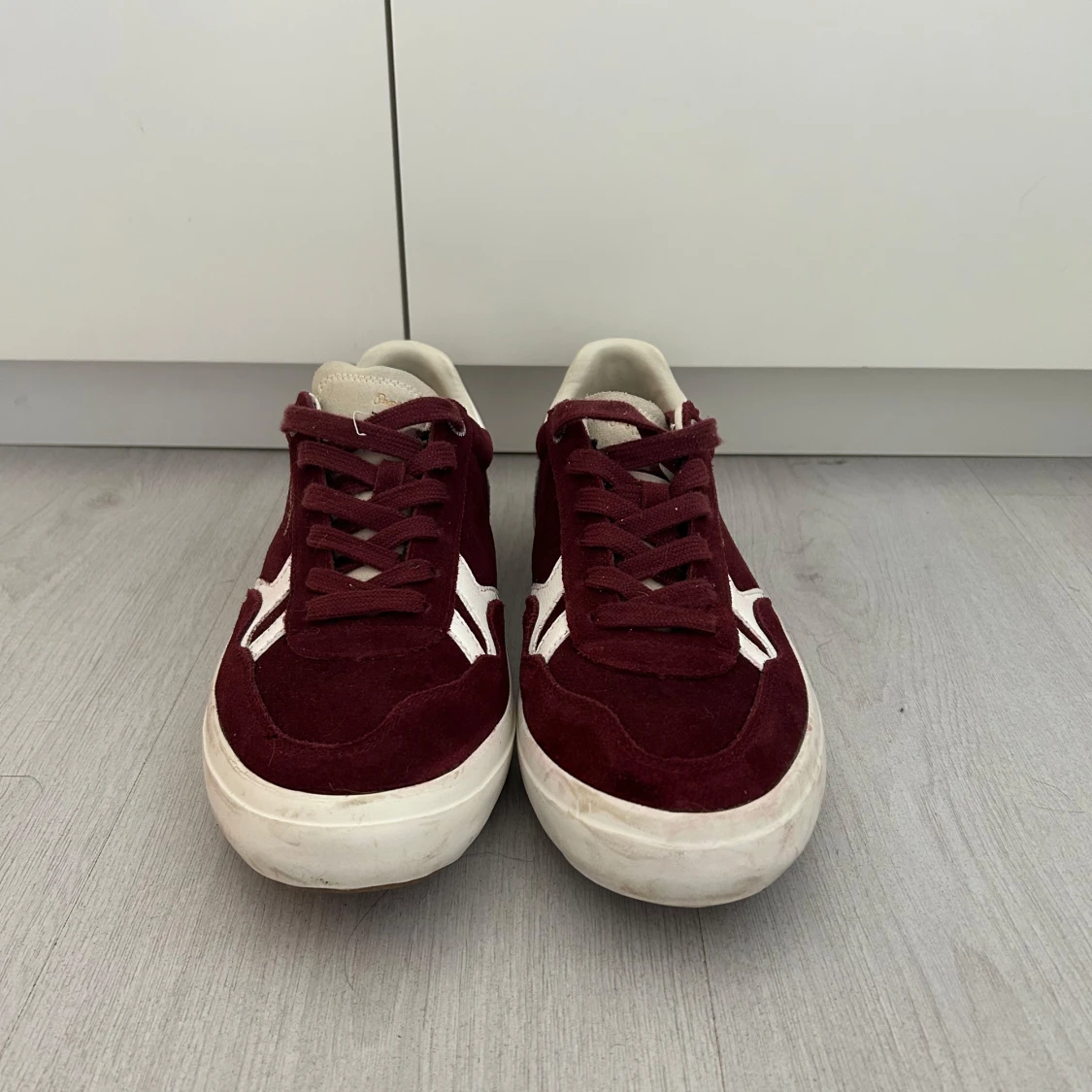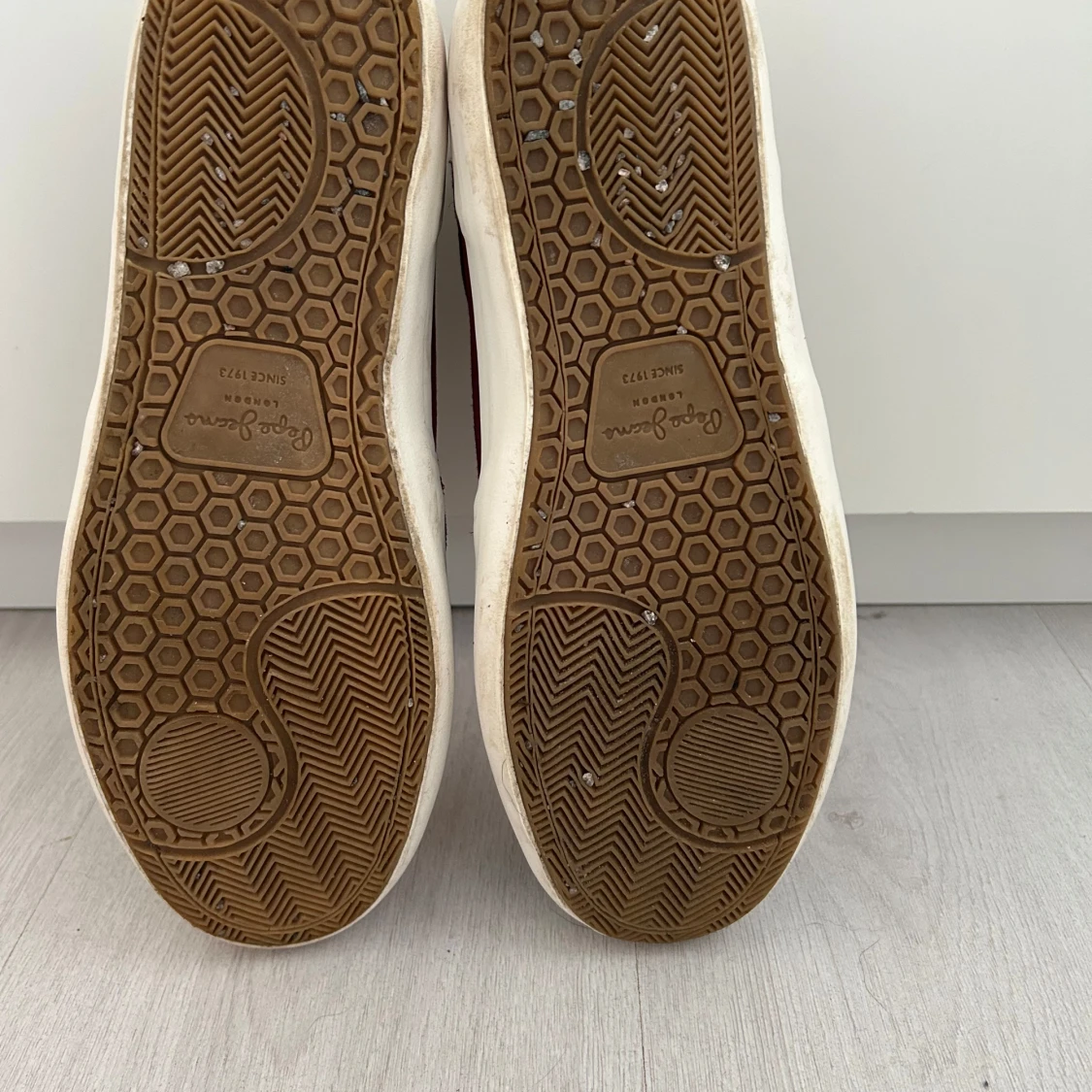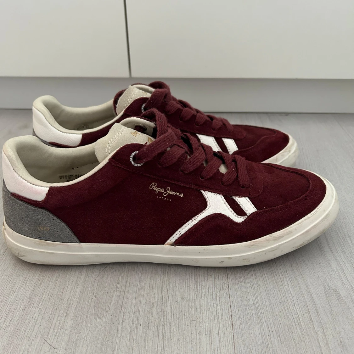 Snygga vinröda sneakers från Pepe Jeans med vita detaljer och snörning. Skorna är jättesparsamt använda och är i jättebra skick. Det sitter några småstenar i sulan som lätt går att plocka bort annars är skorna perfekta. Storlek 43 och sitter true to size. Hör av dig vid frågor!