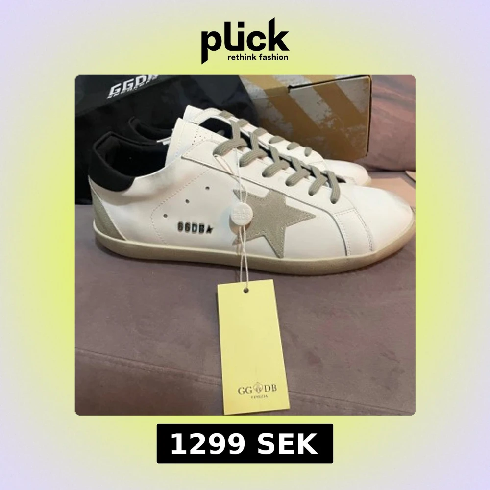 Säljer ett par GGDB sneakers i vitt skinn med grå mockadetaljer och stjärna på sidan. Skorna har grå snörning, svart häl och platt sula. Ikonisk GGDB-logga på sidan och kommer med originalkartong och dustbag. Perfekt för dig som gillar clean och stilren look.