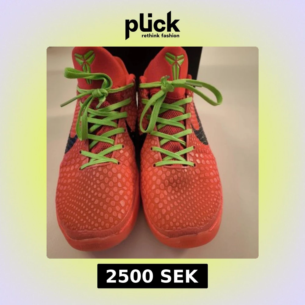 Nike Kobe 6 Protro Reverse Grinch. Snygga röda sneakers med gröna snören och detaljer. Skorna har en unik textur och en svart sula med gröna logotyper. Perfekta för den som vill sticka ut med färgglada skor.