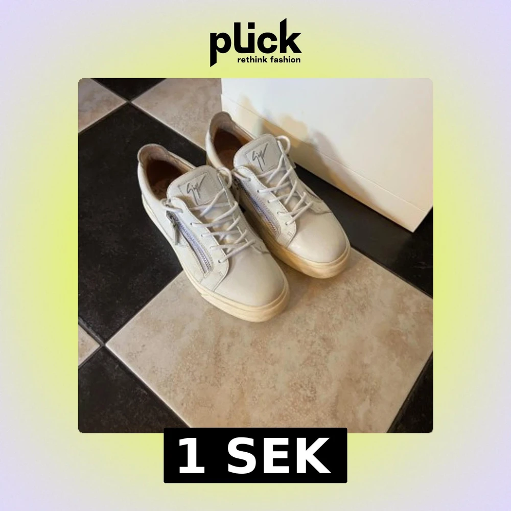 Säljer ett par vita sneakers från Giuseppe Zanotti med snörning och dragkedja på sidorna. Skorna har en platt sula och rund tå, samt märkets logga på plösen. Perfekta för en stilren och trendig look.