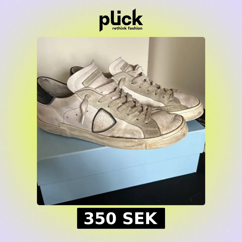 Säljer ett par philippe models. Ingår låda och dustbag. Se skick och skador samt ett hål i sidan på skon som jg försökt laga med limm och nån gummibit. Pris kan diskuteras.