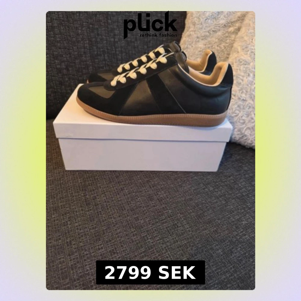 Stilrena svarta sneakers med beige detaljer och kontrasterande ljus sula. Skorna har snörning och en mix av skinn och mocka i materialvalen. Perfekta för dig som gillar en klassisk men modern look.