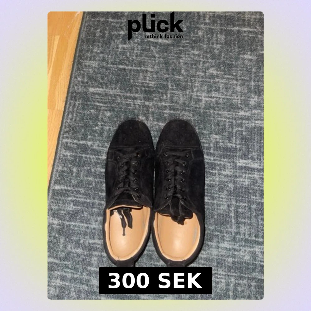 Svarta sneakers i mocka med snörning och rund tå. Skorna har en cool kontrast med röd platt sula och svart ovandel. Perfekta för dig som gillar stilrena men ändå unika detaljer. Passar till många olika outfits och har en klassisk sneaker-look. Pris kan diskuteras vid snabb affär. hålen är limmat o funkar fint!