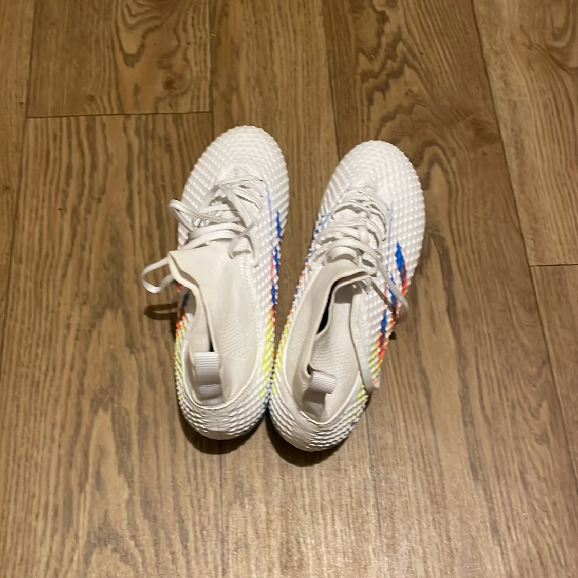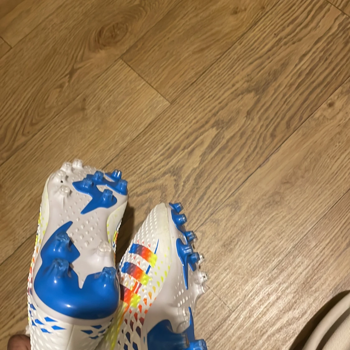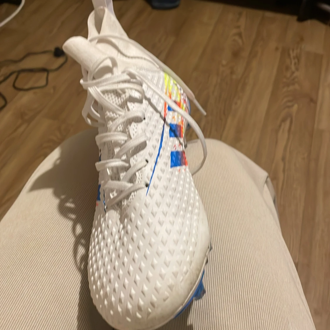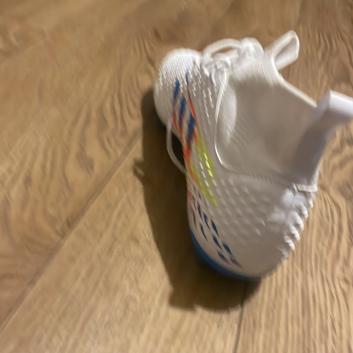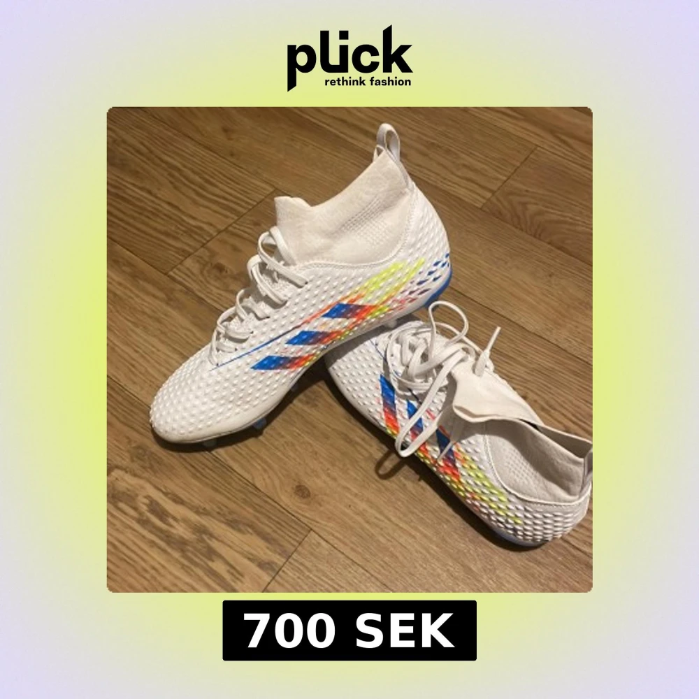 Snygga vita fotbollsskor med färgglada detaljer i blått, gult och rött. Skorna har snörning och en mönstrad yta för extra grepp. Perfekta för fotbollsplanen med sina blå dobbar.