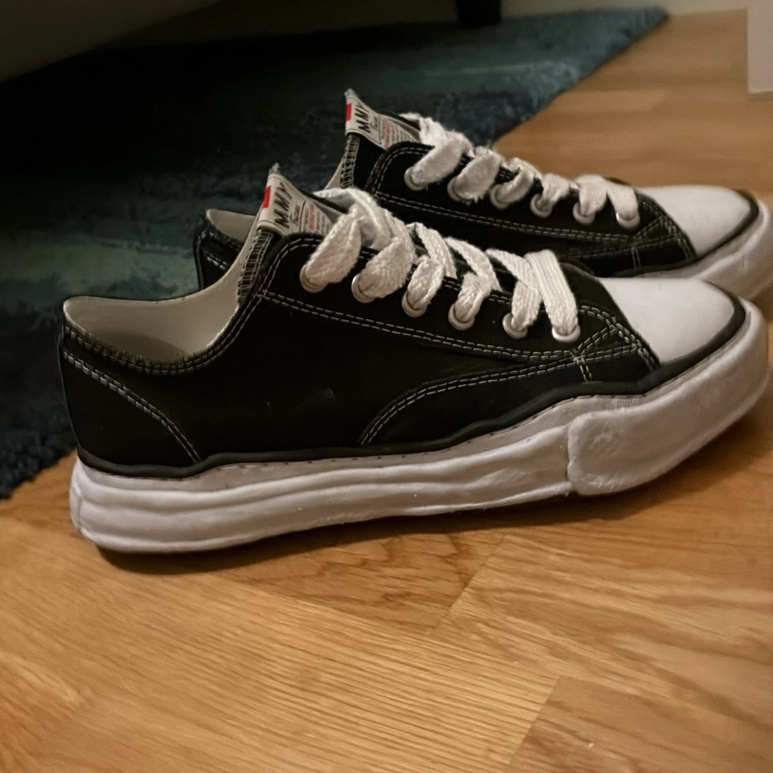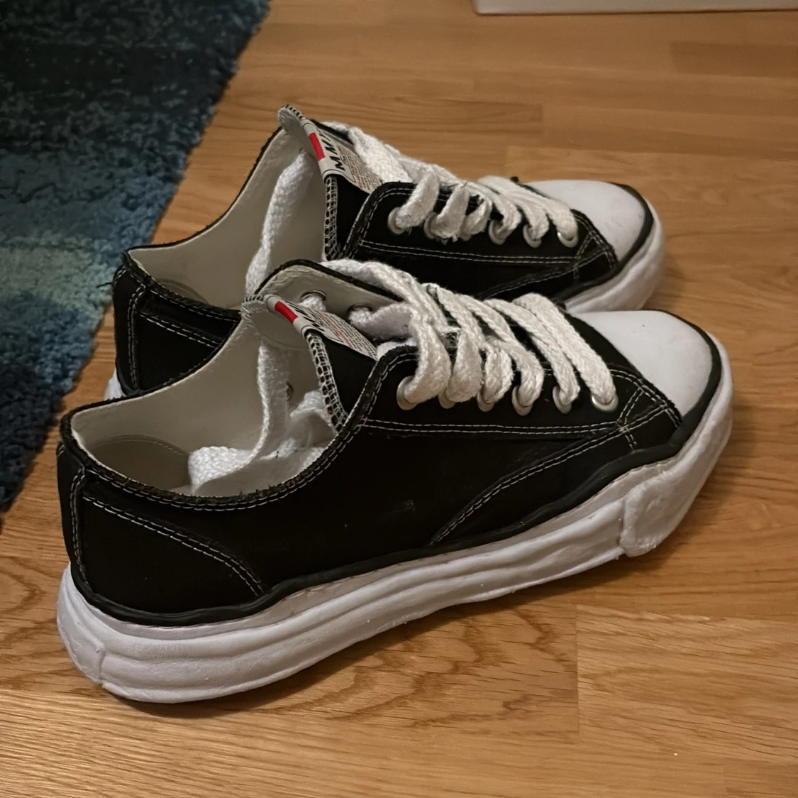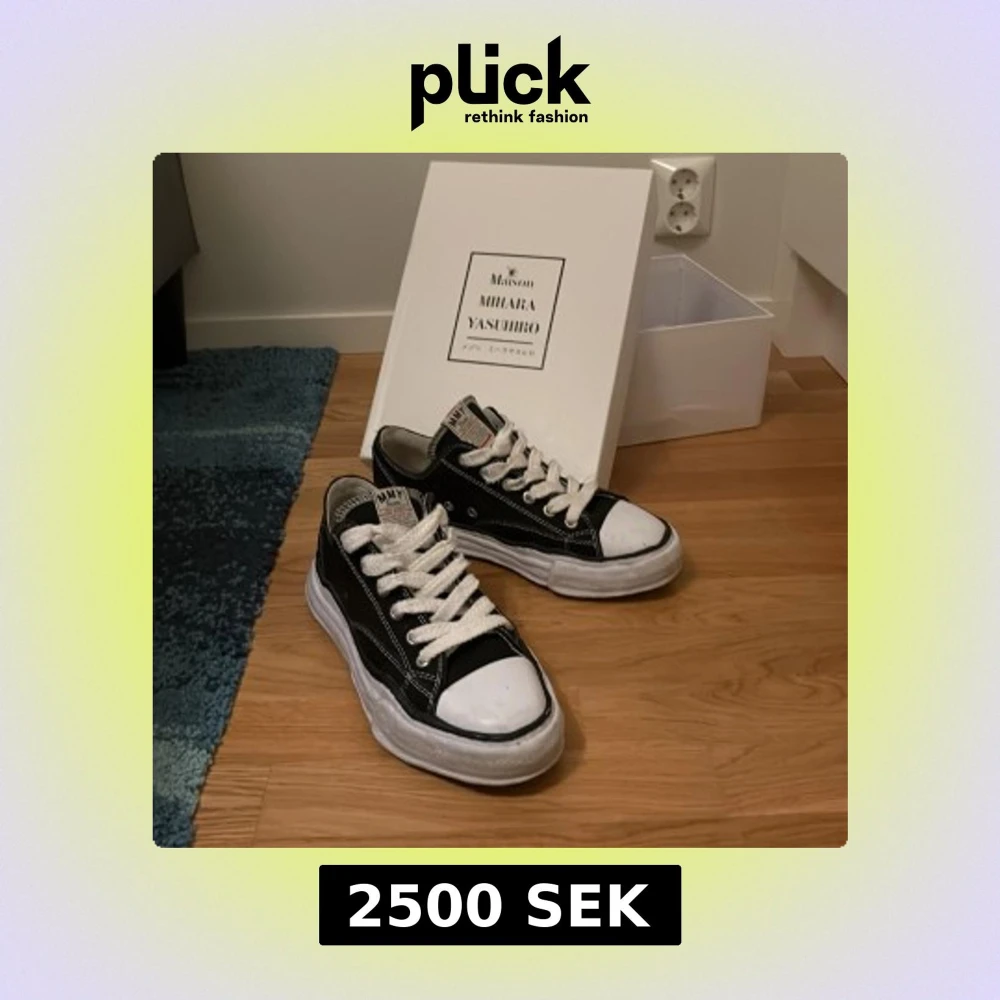 Svarta sneakers från Maison Mihara Yasuhiro med chunky vit sula, vita kontrastsömmar och breda vita skosnören. Klassisk låg modell med rund tå och vit tåhätta. Rå och unik design. Självklart äkta, köpta på Vestiaire där jag även lite med en ”legit check” med skorna som appen erbjuder, därav märket på bild 4. Hör av dig vid frågor!