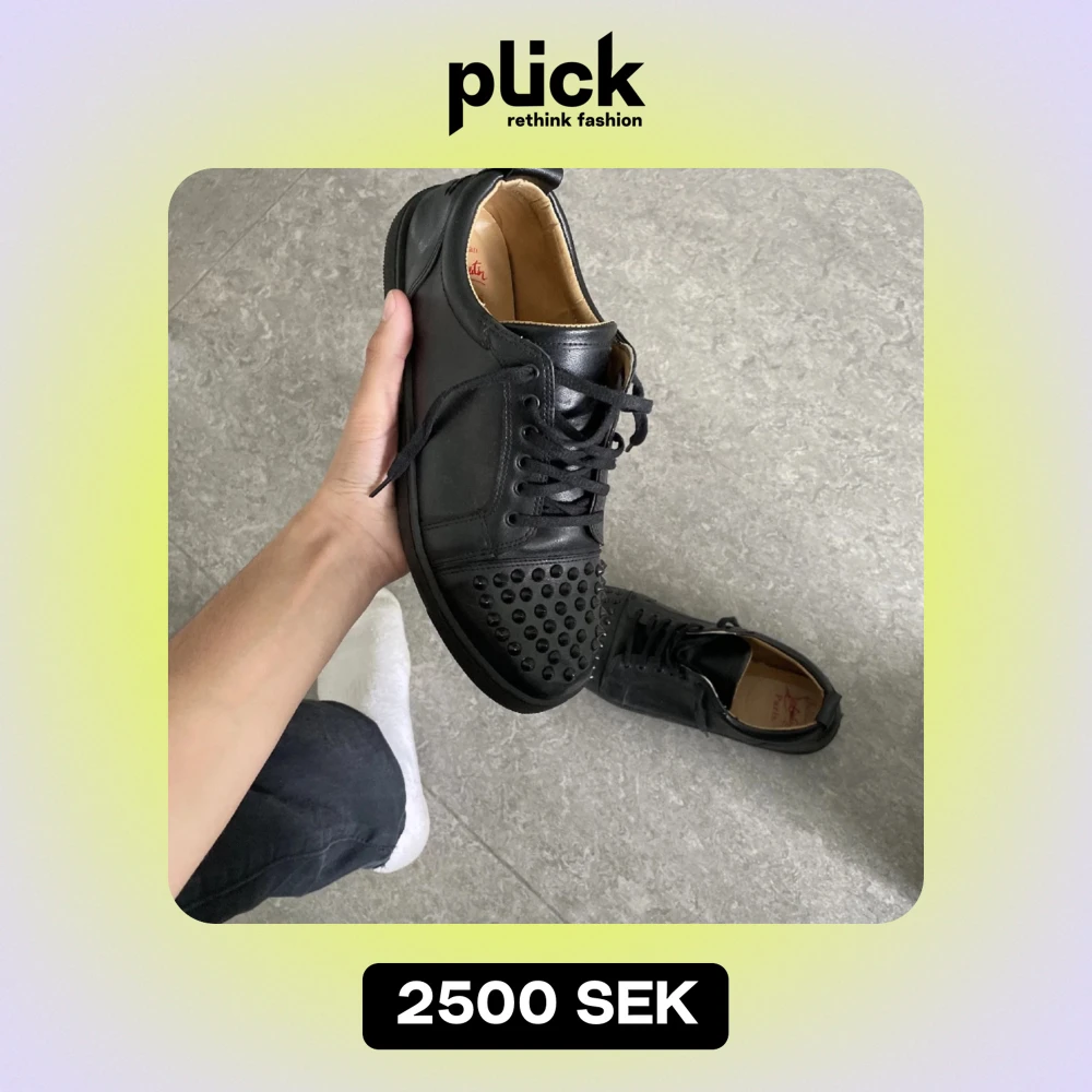Säljer ett par svarta sneakers i skinn med coola nitar på tån. De har en röd sula som ger en snygg kontrast och snörning för perfekt passform. Perfekta för att ge din outfit en edgy touch!
