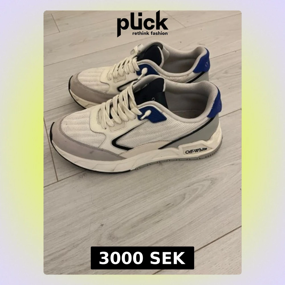 Säljer ett par snygga Off-White sneakers i vitt med blå och svarta detaljer. Skorna har mesh- och skinnpaneler, snörning och en chunky platt sula. Märket syns tydligt på sidan och tungan. Perfekt för dig som gillar streetwear och vill sticka ut.