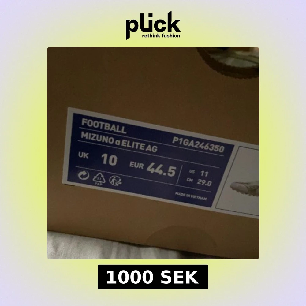 Säljer ett par Mizuno α Elite AG fotbollsskor i storlek 44.5. Skorna är vita med guldiga detaljer och ett grafiskt mönster, har snörning och platt sula med dobbar för gräsplan. Snygg design med Mizuno-logga på sidan och lätta material för snabbhet.