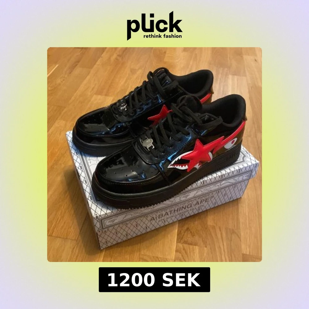 Säljer ett par svarta BAPE sneakers i glansigt syntetmaterial med röd stjärna och hajmotiv på sidan. Skorna har snörning, platt sula och färgglada bokstäver bak. Kommer med originalkartong och BAPE-tag. Knappt använda. Pris kan diskuteras