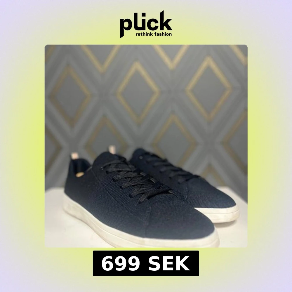 Snygga marinblåa sneakers från primark med vit sula och diskret snörning. De har en stilren design med en röd och vit randdetalj på hälen. Perfekta för en avslappnad stil.