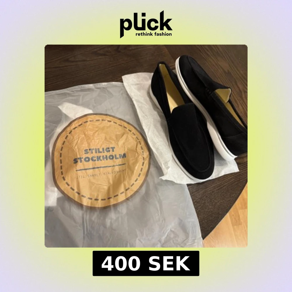 Snygga svarta loafers från Stiligt Stockholm i mjuk mocka med vit platt sula. Köpte fel storlek, dom är helt nya och fräscha och redo för att användas köpta för 800