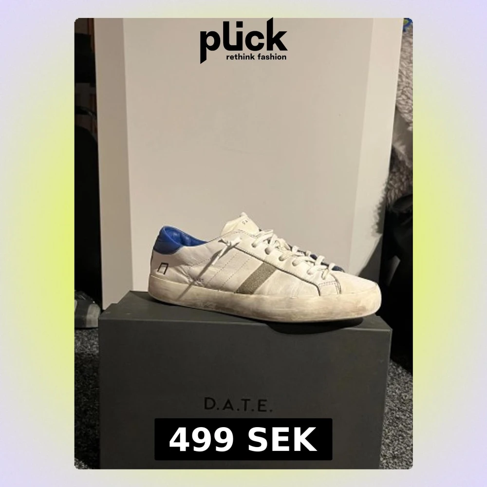 Snygga vita sneakers från D.A.T.E. med blå häl och grå rand på sidan. Skorna har snörning, rund tå och platt sula. Tillverkade i skinn med en stilren design som passar till jeans och t-shirt. Perfekt för dig som gillar cleana och moderna sneakers. Nypris runt 2000