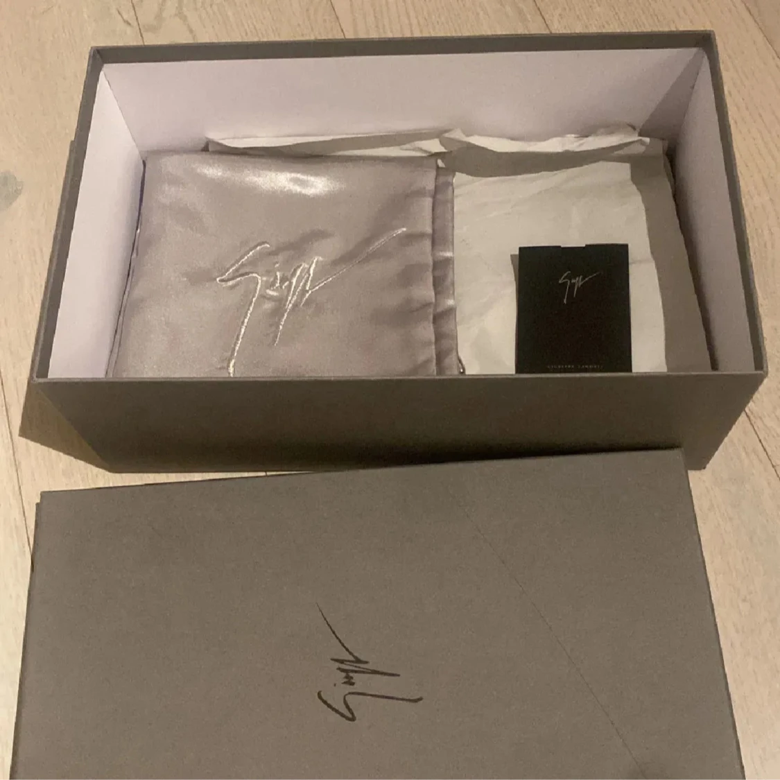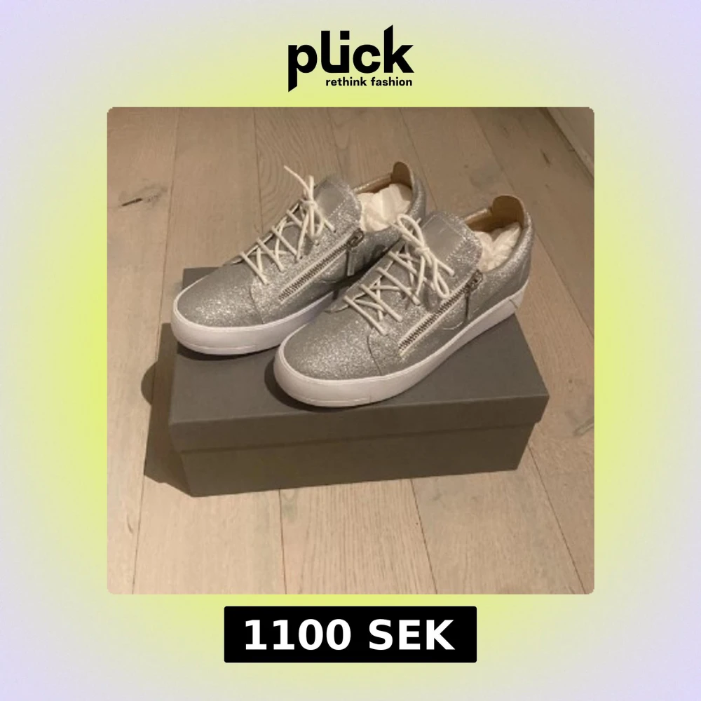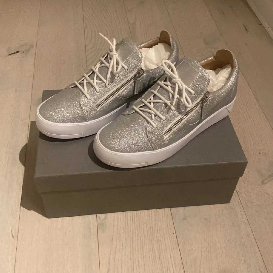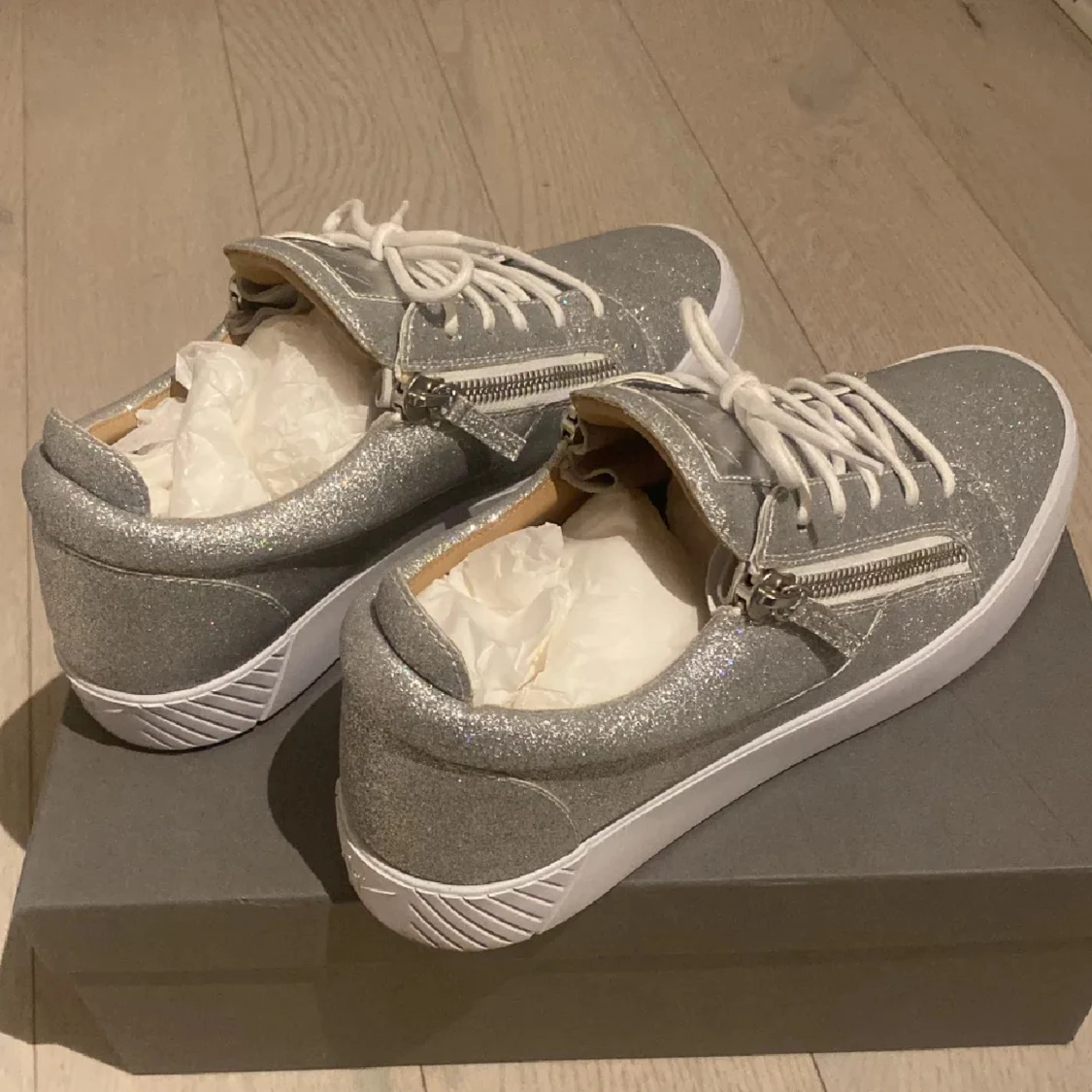 Säljer ett par riktigt snygga sneakers från Giuseppe Zanotti i silver med glittrig finish. Skorna har vita snören, dragkedjor på sidorna och rund tå. Perfekta för dig som vill sticka ut med din stil!