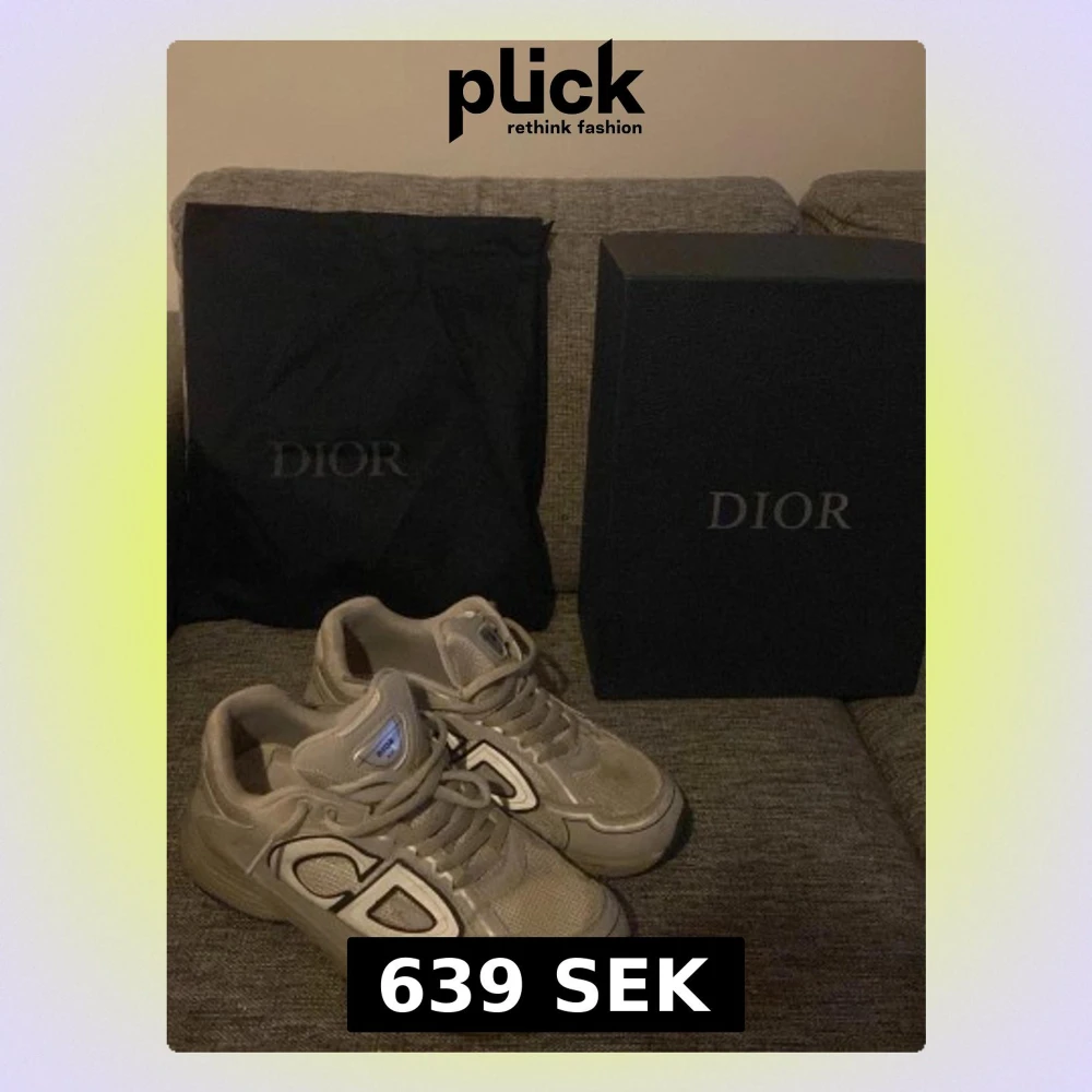 Säljer ett par sneakers med stora reflekterande CD-loggor på sidorna. Skorna har snörning, meshpaneler och detaljer i syntet och skinn. Kommer med originalkartong och dustbag. Perfekta för dig som vill sticka ut med exklusiva och trendiga sneakers.