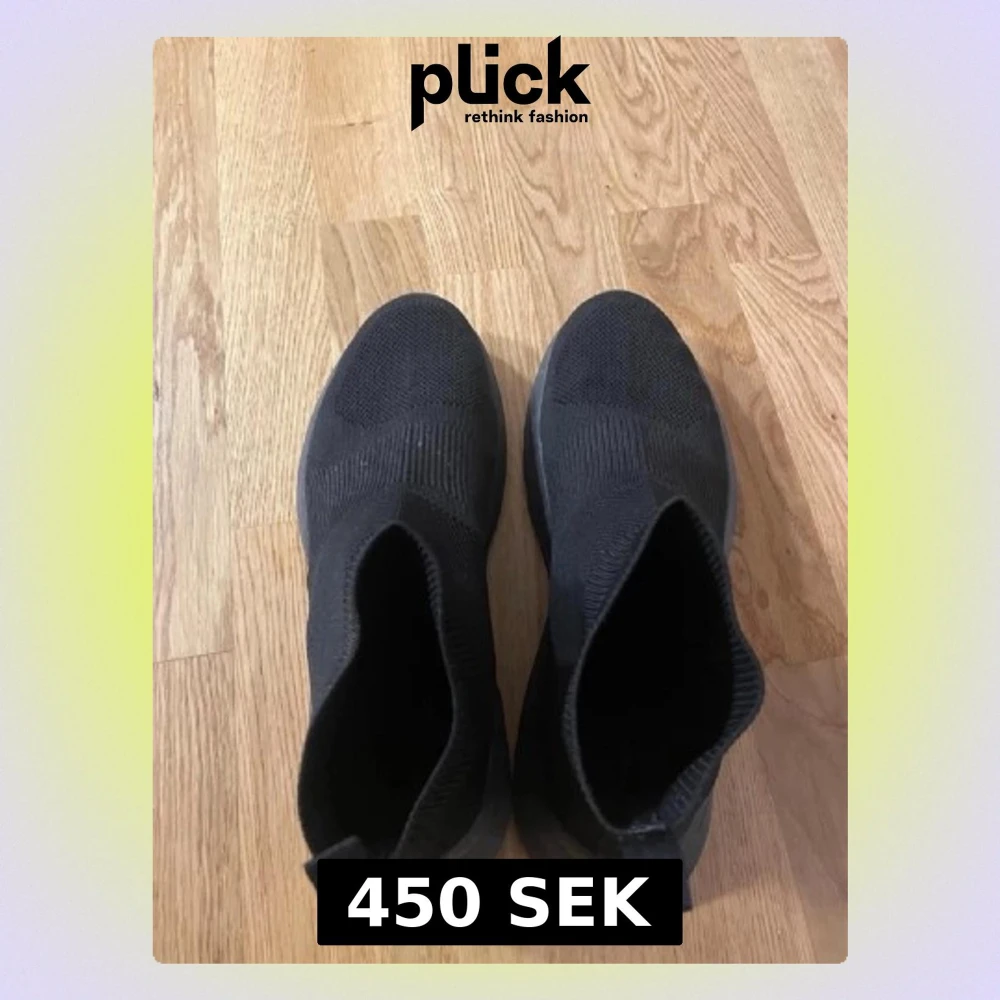 Säljer ett par svarta sneakers med stickad ovandel och platt sula. Skorna har en strumpliknande design utan snörning, vilket gör dem enkla att ta på. Perfekt för dig som gillar minimalistisk stil och komfort. Passar till både jeans och mjukisbyxor.
