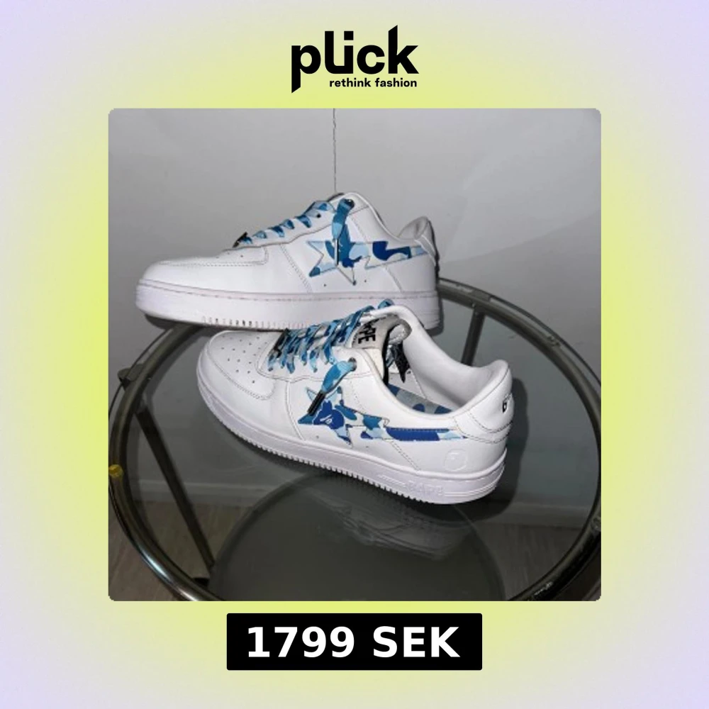 BAPE STA sneakers i vitt skinn med blå och ljusblå camo-detaljer på sidan och matchande blå camo-skosnören. Klassisk låg modell med perforerad tå och tydlig BAPE-logga på plösen och hälen. Perfekta för dig som vill sticka ut med streetwear.