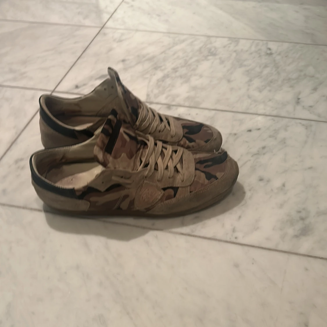Snygga sneakers med ett coolt camouflage-mönster från philipe modell.Skorna har snörning och är tillverkade i en kombination av skinn och mocka. Perfekta för dig som vill sticka ut med stil lite slitna men sjukt snygga .pris diskuteras vid snabb deal. Inget og då slängt boxen!
