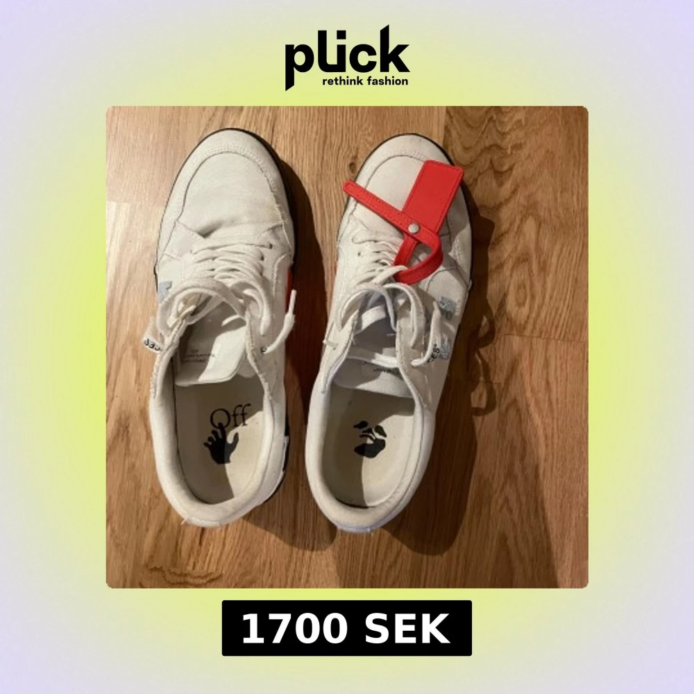 Säljer ett par vita Off-White sneakers med svartvit randig sula, ikonisk pil-logga på sidan och en röd tag på snörningen. Skorna har snörning, platt sula och är tillverkade i canvas. Snygg streetstil med tydliga Off-White detaljer. Dustbag ingår!