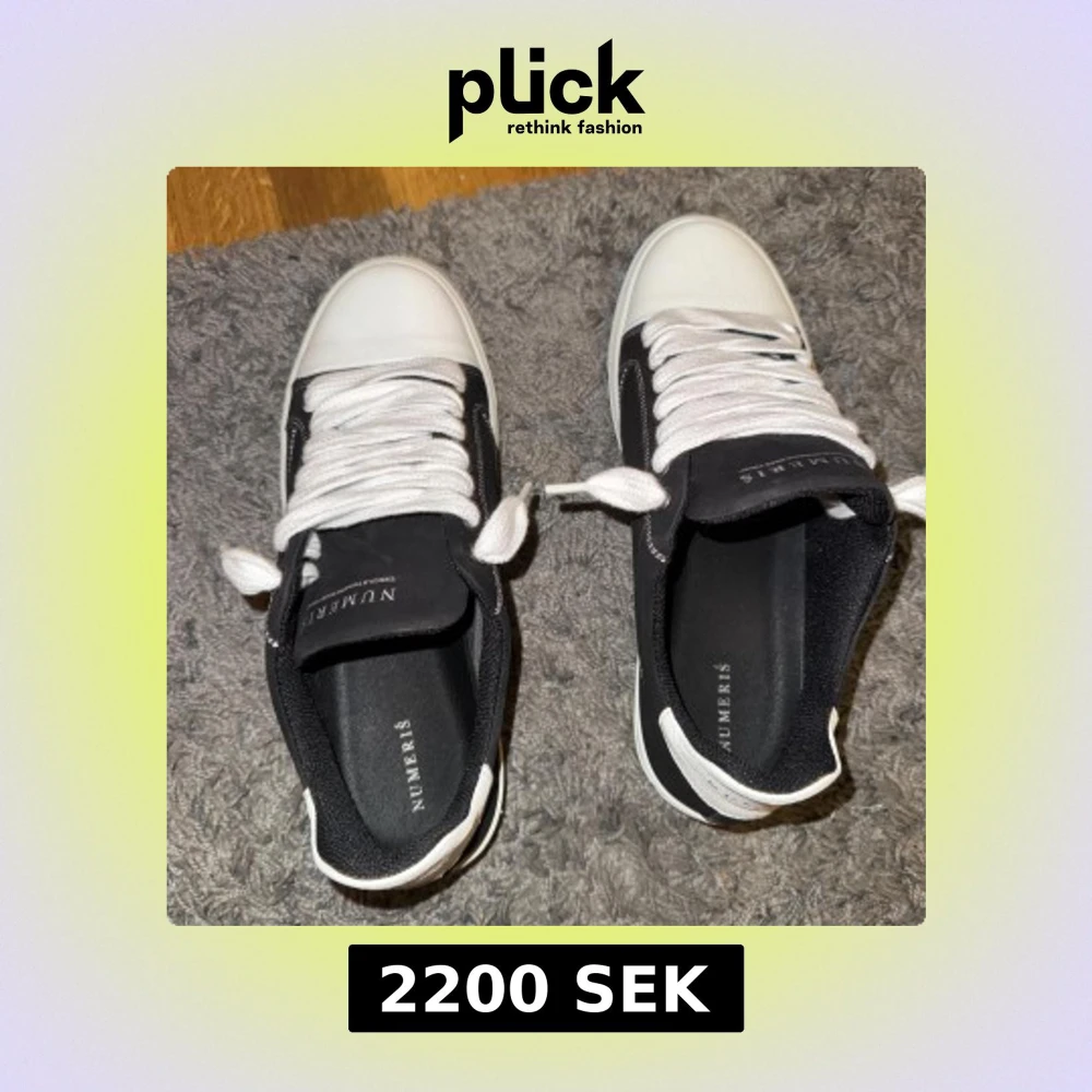 Snygga svarta sneakers från Numeris med vita detaljer och grov, räfflad sula. Skorna har vita snören, vit tå och häl samt kontrasterande vita sömmar. Ovandelen är i ett matt material och sulan är extra chunky för en modern look. De har inte använts bara testats. De är såklart äkta kan visa order nummer samt kvitto. Säljer de på grund av att de är för stora. Säljer skorna även för 200 kr billigare än online.