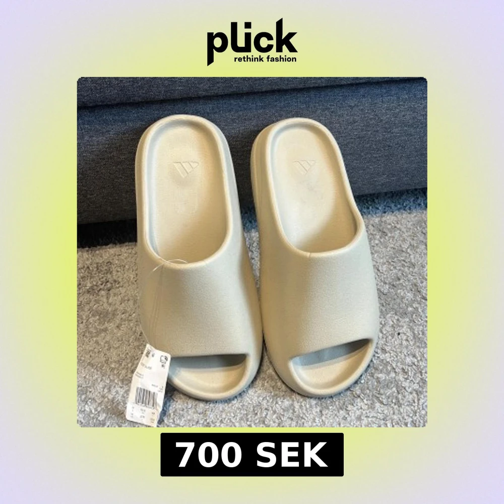 Säljer ett par beige Yeezy Slides från Adidas. De har en minimalistisk design med öppen tå och platt sula, tillverkade i syntetmaterial. Perfekta för en avslappnad stil och riktigt bekväma att ha på sig. De är bara testade och inte använda