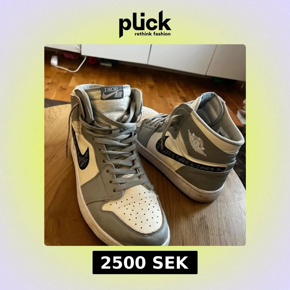Snygga grå och vita sneakers från samarbetet mellan Dior och Nike. Skorna har en hög modell med snörning och den ikoniska Nike-loggan i ett unikt mönster. Perfekta för den som vill ha något exklusivt och stilrent.