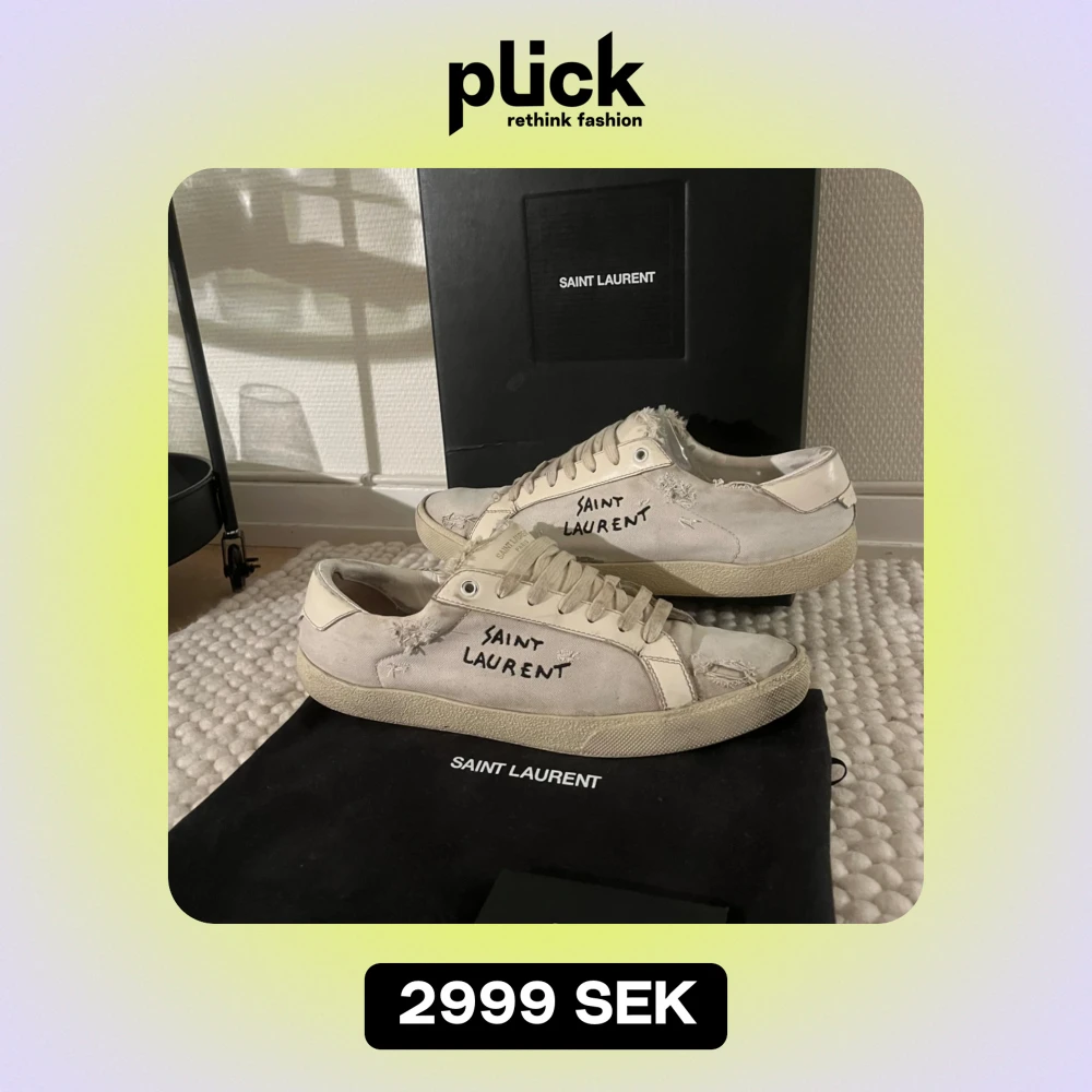 Säljer ett par vita sneakers från Saint Laurent i bra skick strl 45 men sitter mer som 44. Riktigt snygga och passar till nästan allt. Låda, dustbag och kort medföljer (spricka i inner sulan på höger sko)