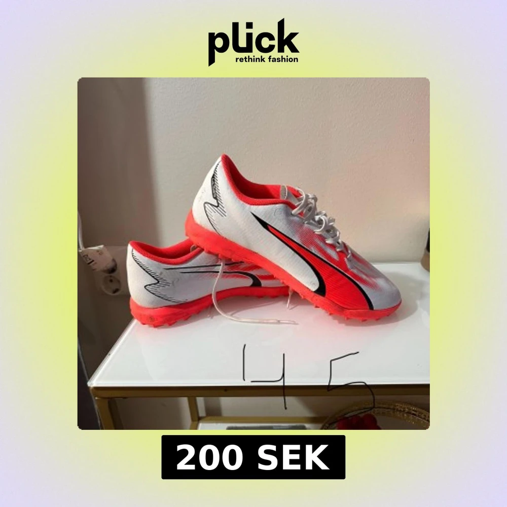 Säljer ett par vita och röda fotbollsskor med snörning och ett par beige sneakers med blå och gula detaljer. Fotbollsskorna har en sportig design med svarta accenter, medan sneakersen har en klassisk look med mocka och textilmaterial.