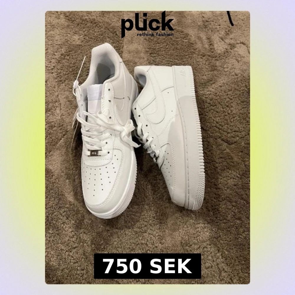 Klassiska Nike Air Force 1 sneakers i helvitt skinn med perforerad tå, snörning och låg profil. Snygg och tidlös modell som passar till allt. Ikonisk Nike Swoosh på sidan och metallbricka med AF1 på snörningen.