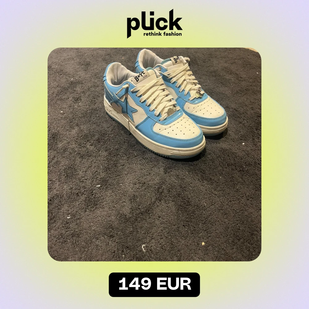 Säljer ett par snygga Bape sneakers i blått och vitt. De har en cool stjärndetalj på sidan och klassisk snörning. Skorna är i mycket bra skick och kommer med originalförpackning och dustbag. Perfekta för både vardag och fest!