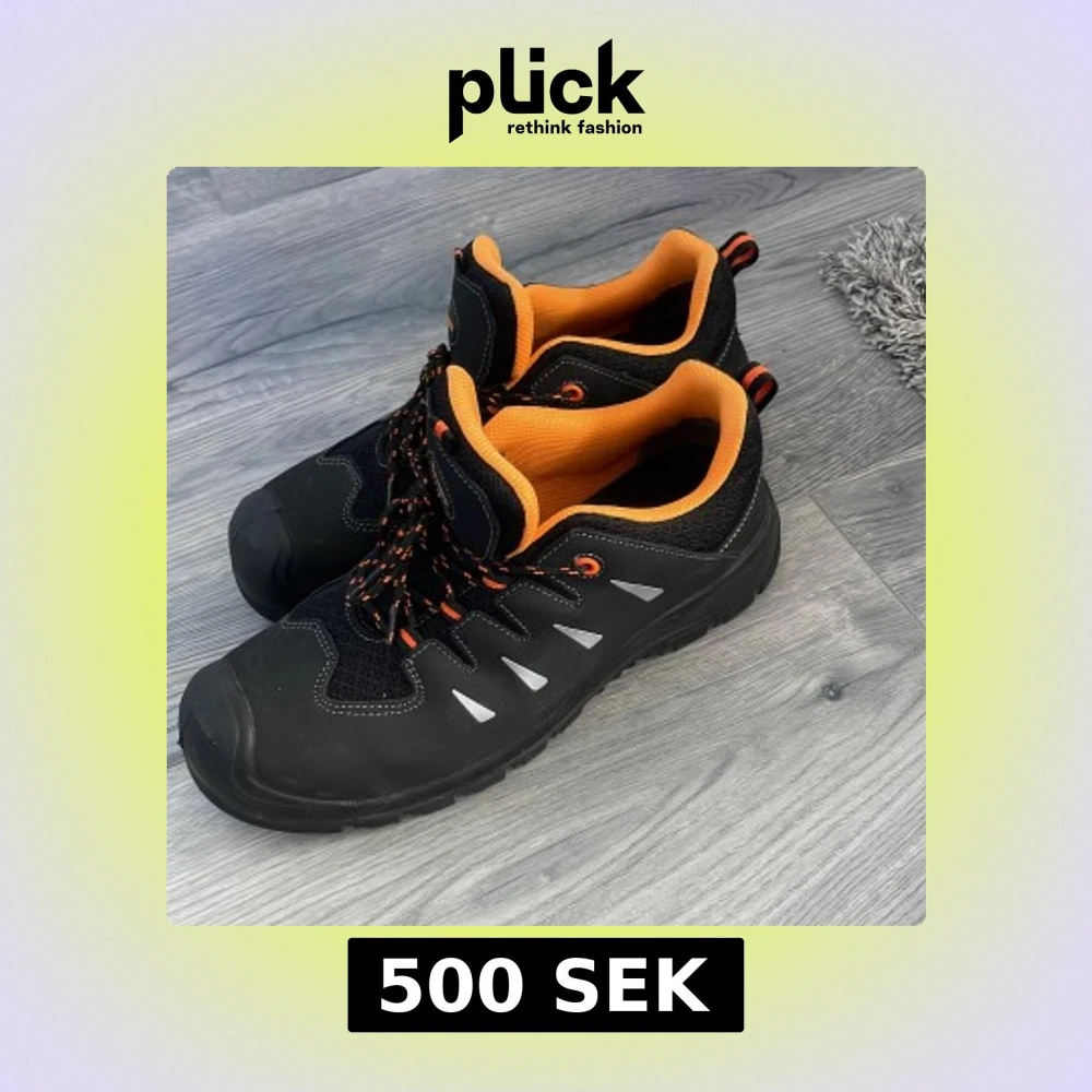 Säljer ett par svarta sneakers med orange insida och detaljer. Skorna har snörning och reflekterande trianglar på sidorna. Perfekta för dig som vill ha en sportig och bekväm stil. helt nya