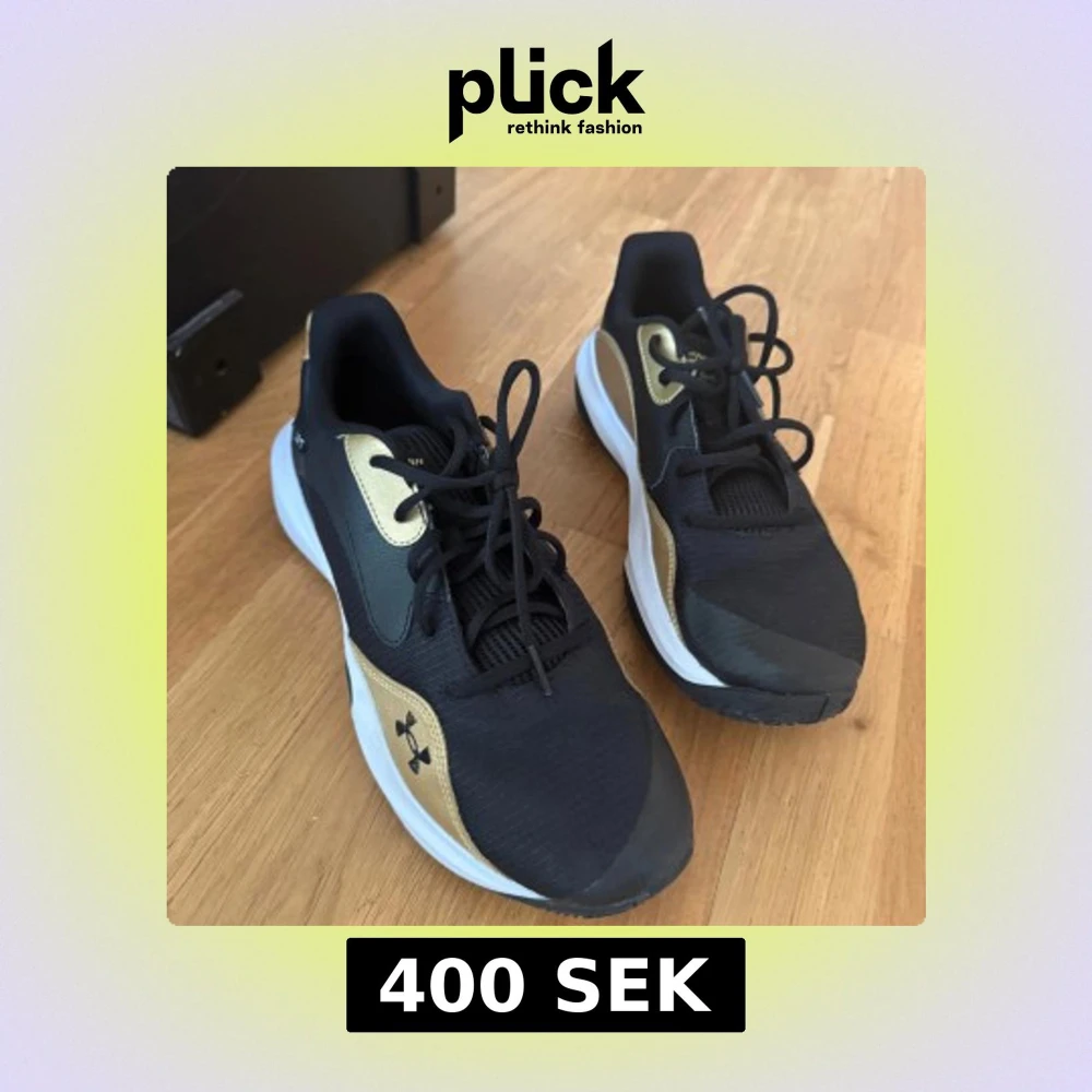 Snygga svarta sneakers med guldiga detaljer från Under Armour. Skorna har snörning, vit sula och rund tå. Perfekta för träning eller vardagsstil.