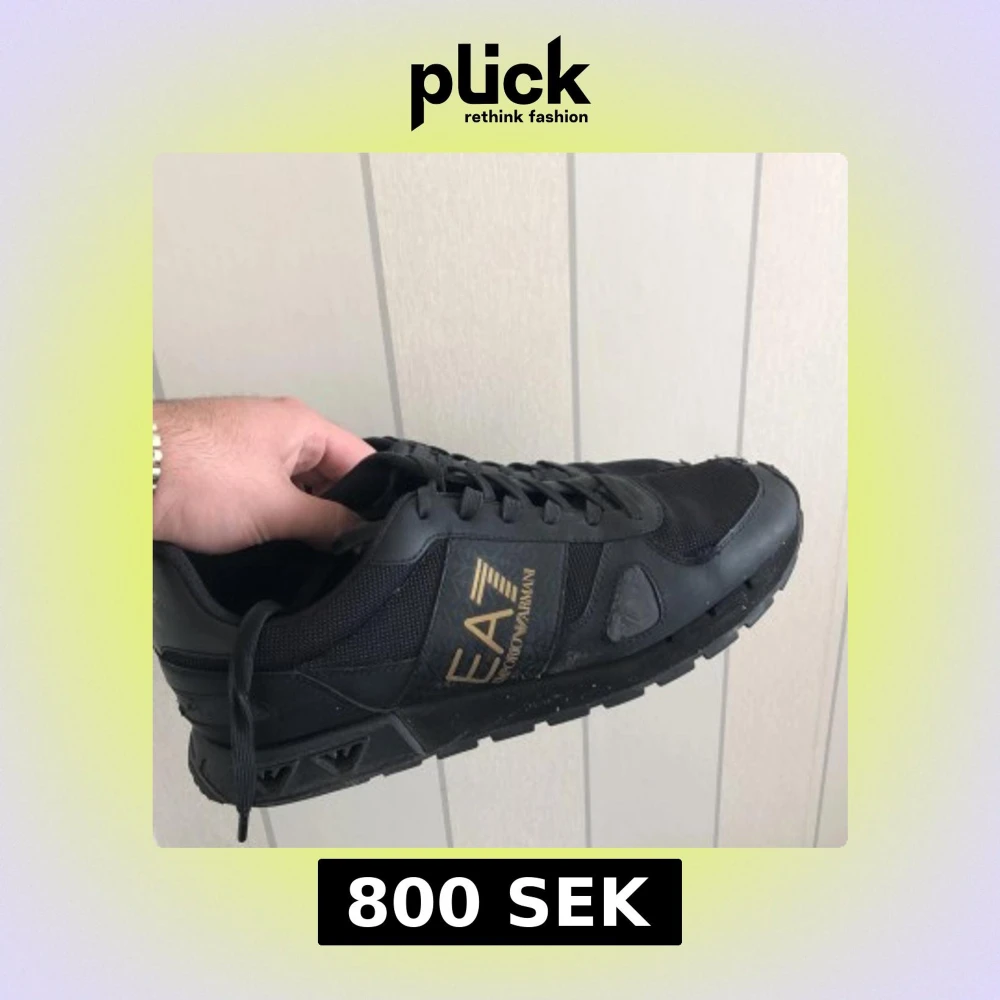 Säljer ett par svarta sneakers från EA7 Emporio Armani med guldfärgad logga på sidan. Skorna har snörning, rund tå och platt sula. Materialet är en mix av syntet och mesh för en sportig look.