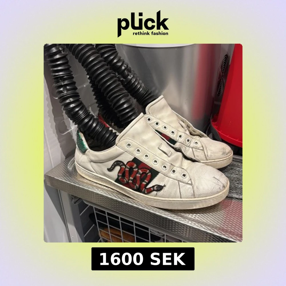 Gucci Ace sneakers i vitt skinn med ikonisk röd och svart orm brodyr på sidan samt gröna och röda detaljer. Klassisk låg modell med rund tå och platt sula. Snygg streetstil med lyxig känsla och unika detaljer. Strl 46 Box och kvitto finns ÄKTA! Välanvända men i snyggt skick