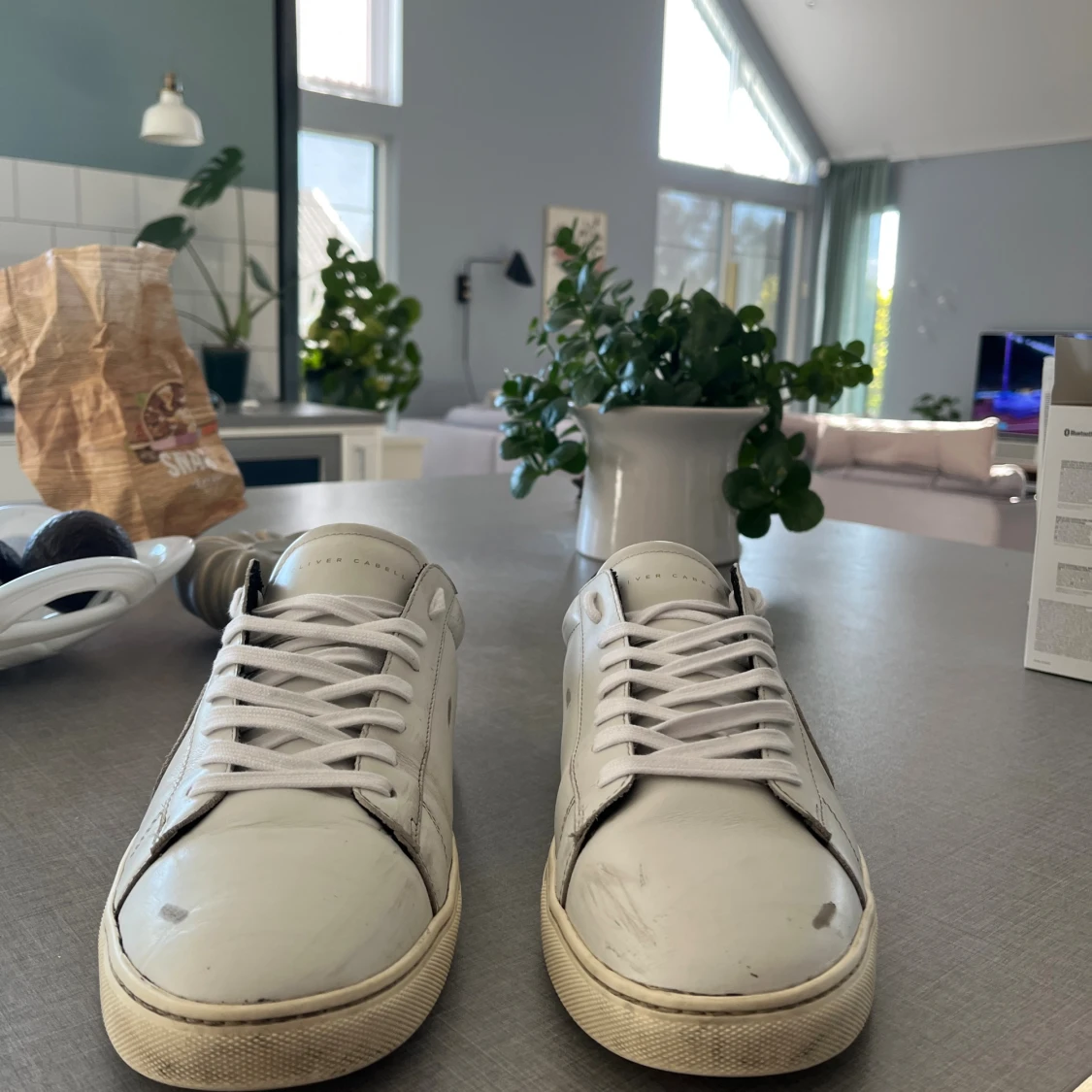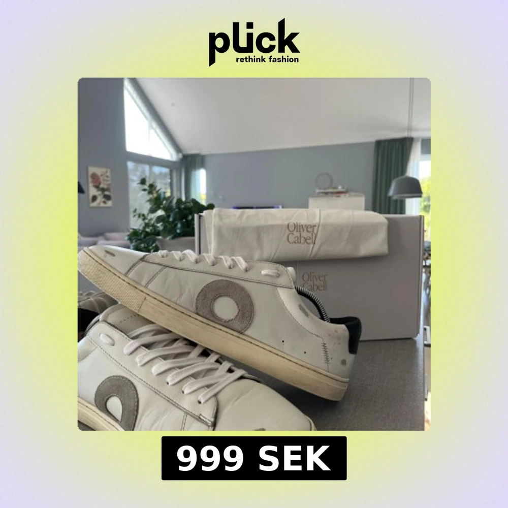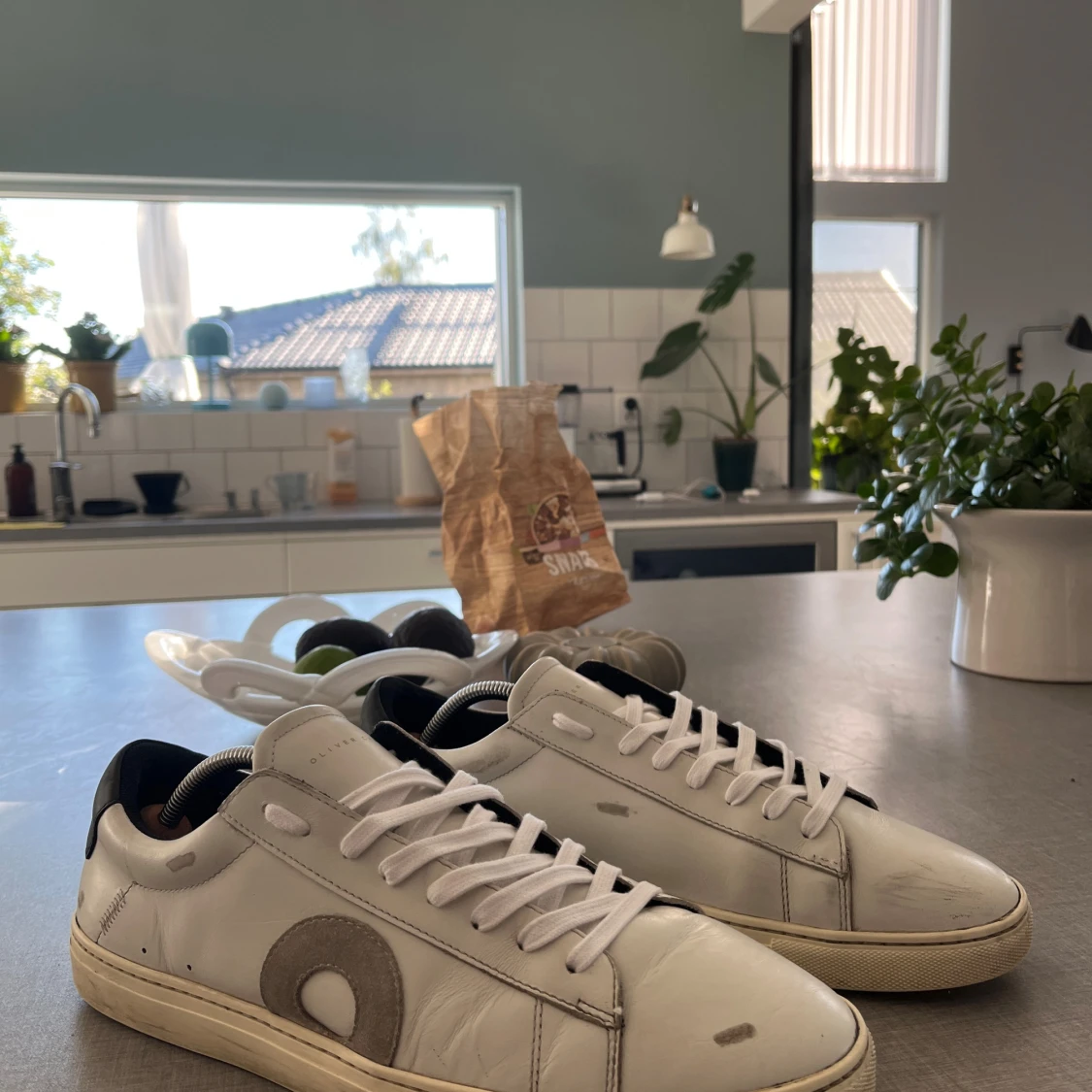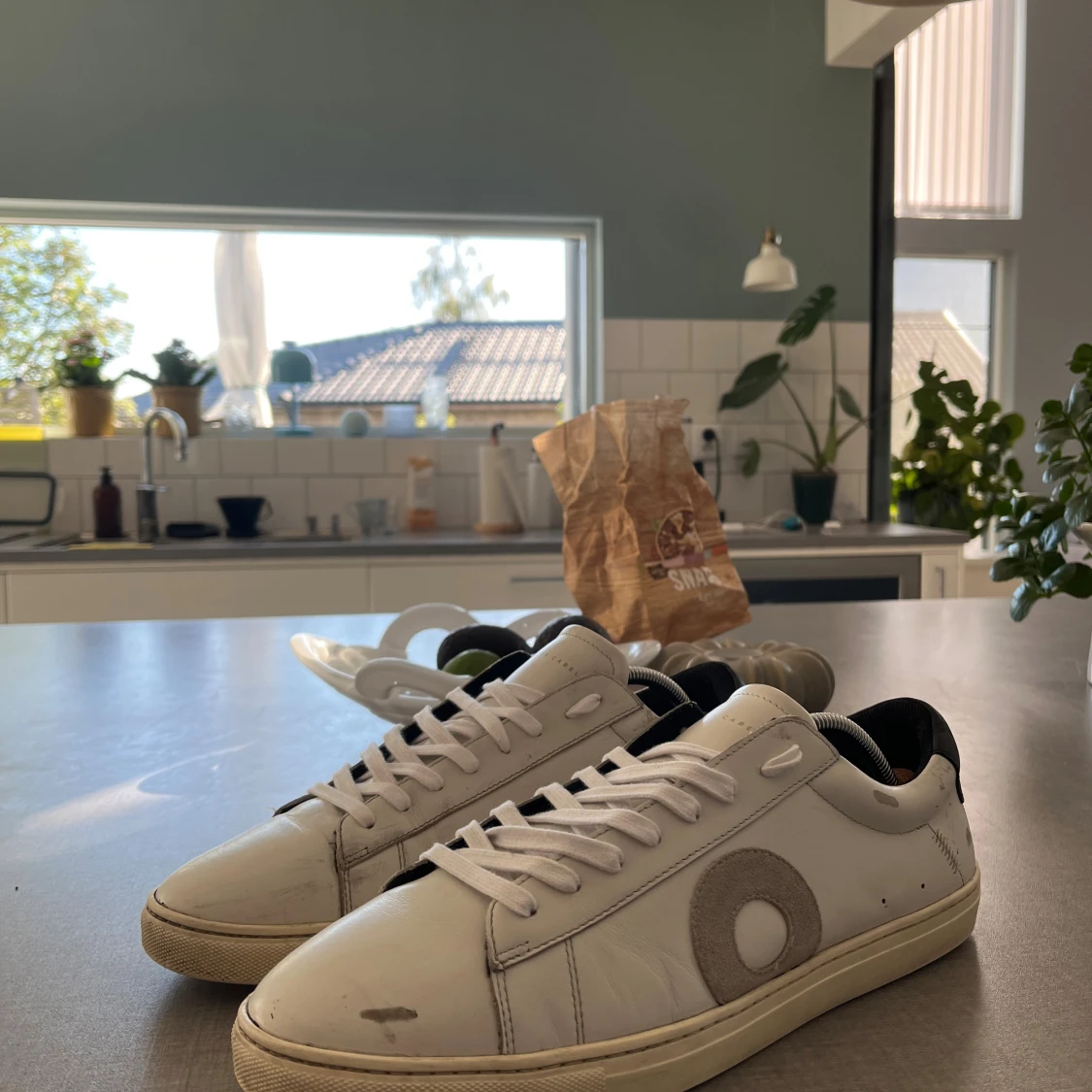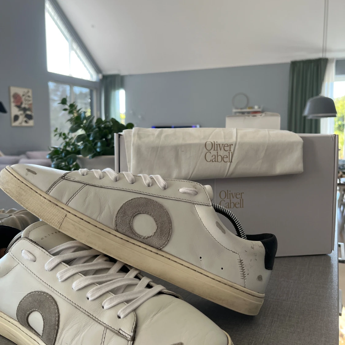 Snygga vita sneakers från Oliver Cabell med grå mockadetalj i form av en cirkel på sidan. Skorna har klassisk låg profil, vita snören och svart hälparti.