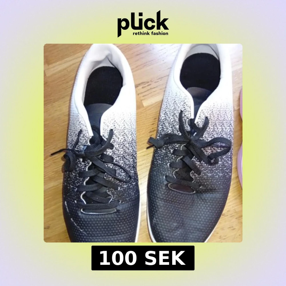 Säljer ett par fotbollsskor i svart och vitt med snyggt färgskiftande mönster. Skorna har klassisk snörning och rund tå. Perfekta för dig som vill sticka ut på planen.