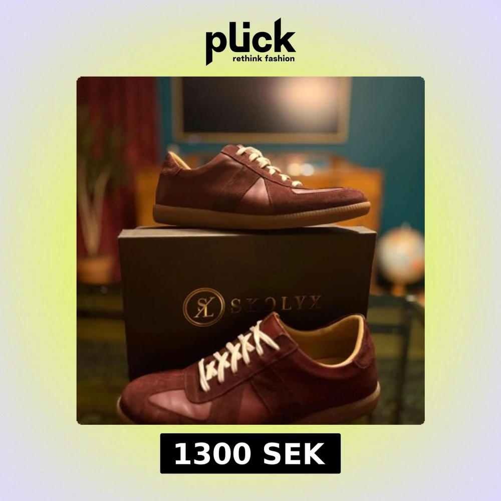 Säljer ett par stilrena vinröda sneakers från Skolyx med snygga kontraster mellan mocka och skinn. Skorna har vita snören, rund tå och beige innersula. Yttersulan är gummifärgad och har ett klassiskt mönster. Perfekt för dig som gillar en clean look med lite edge.