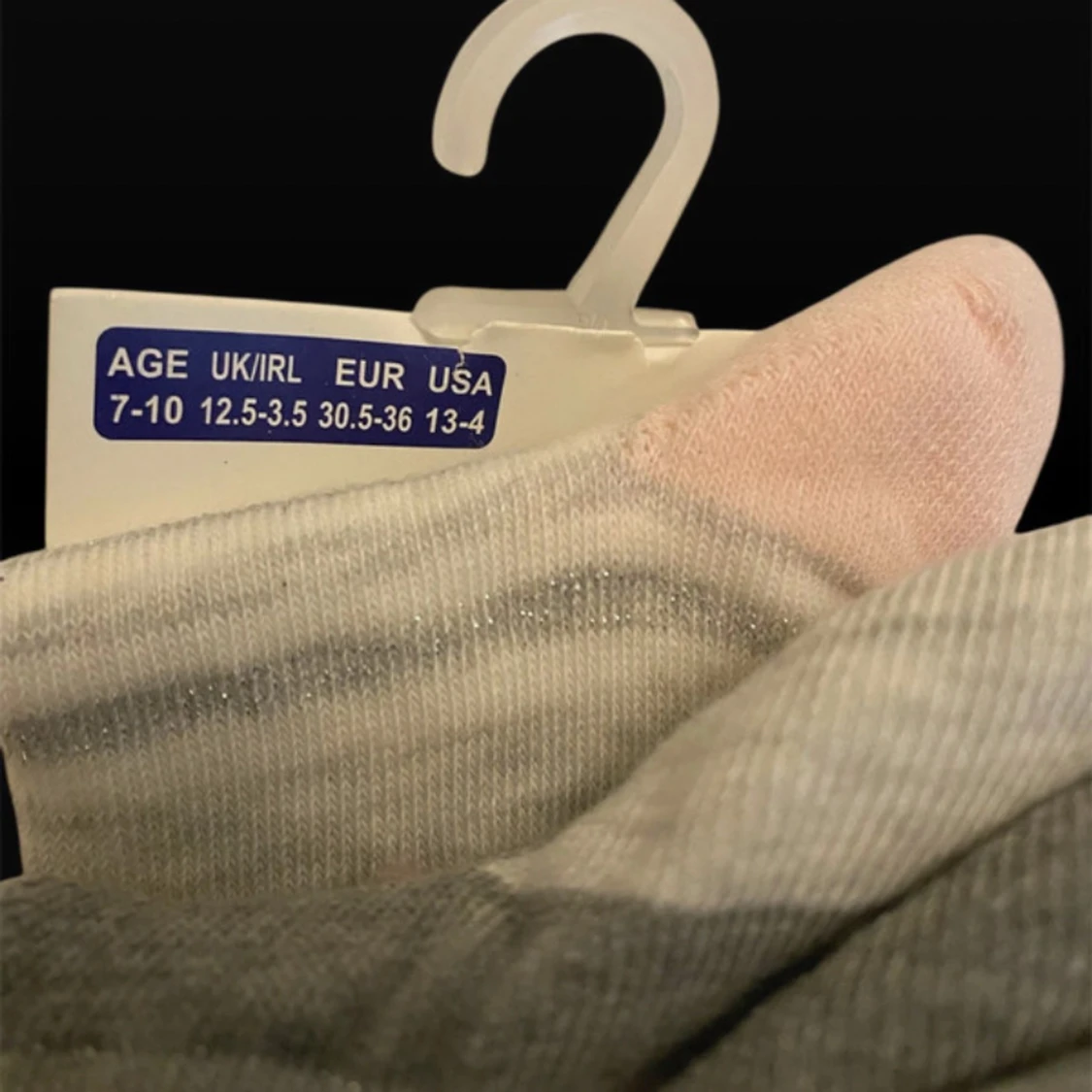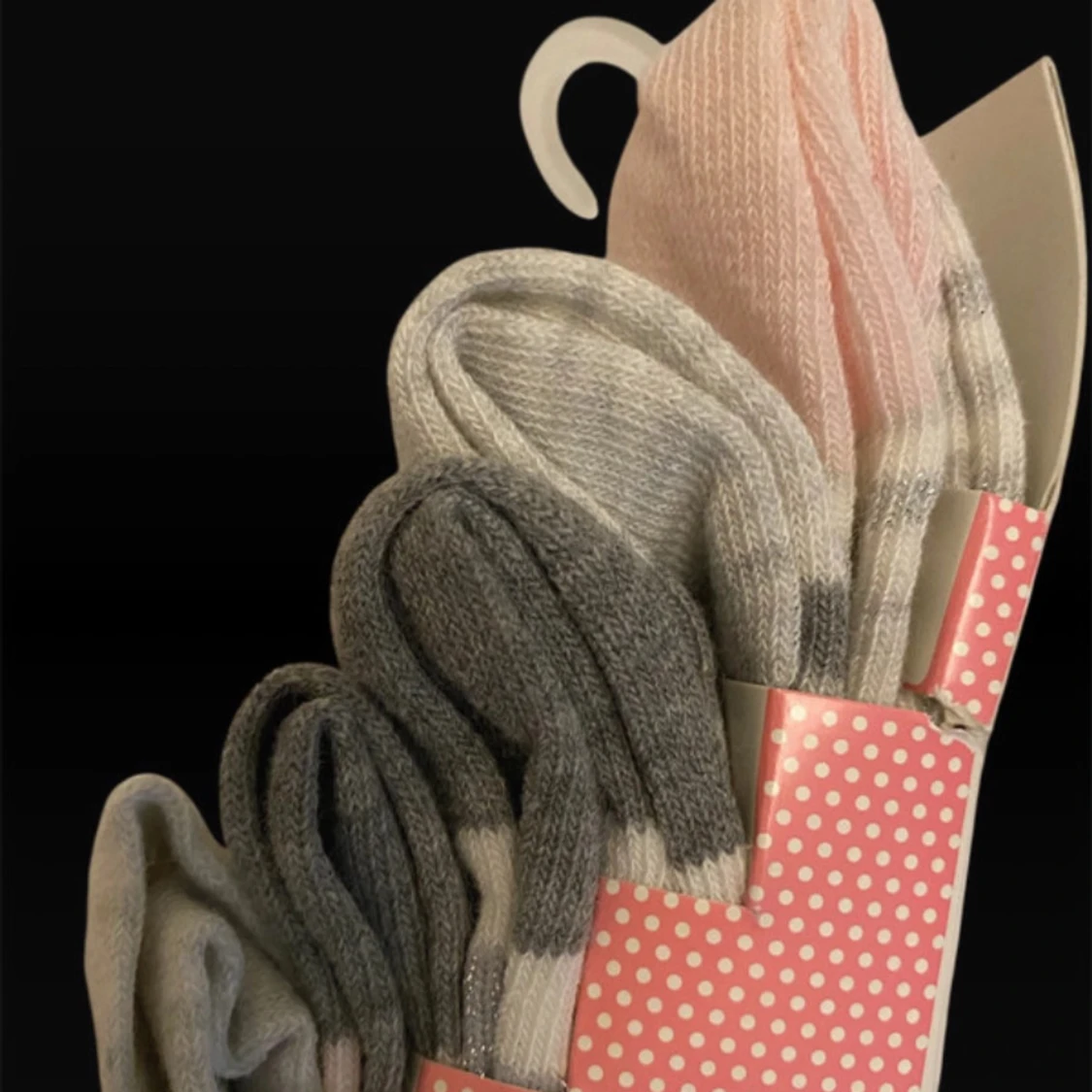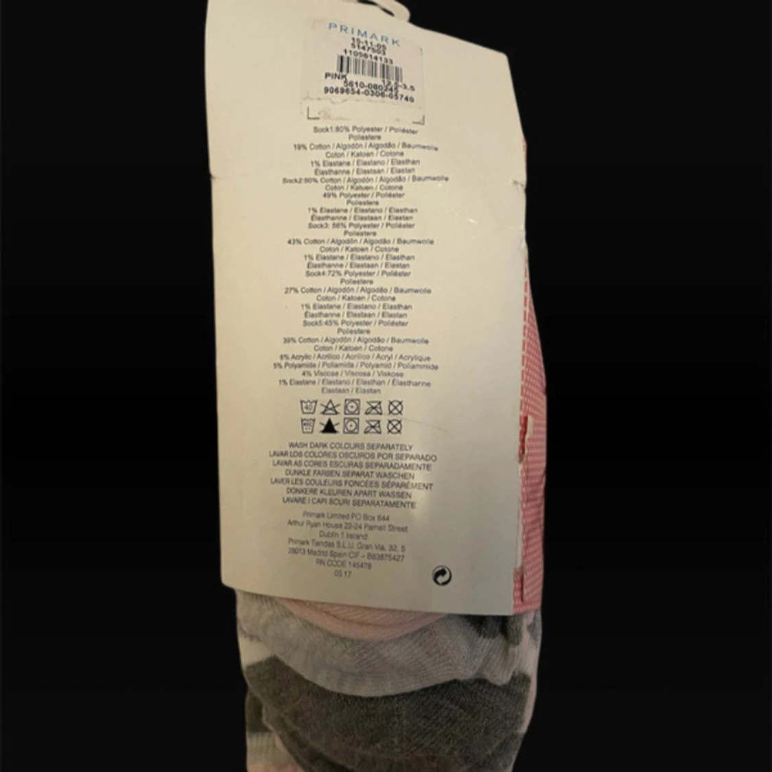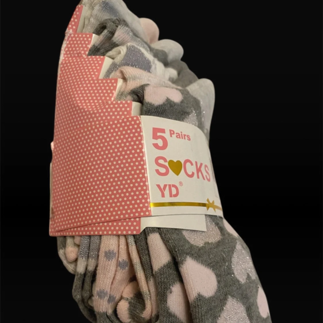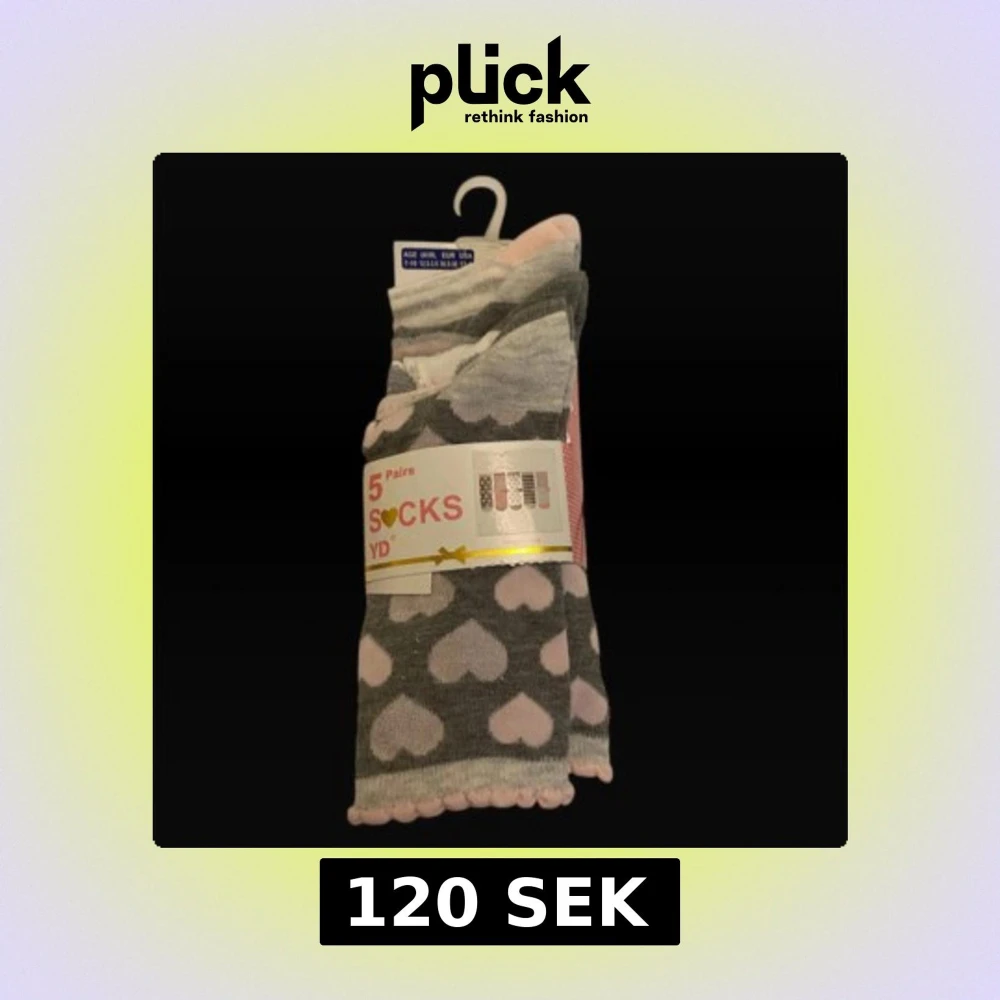 Fem par strumpor från Primark i olika grå, vita och ljusrosa nyanser. Några har hjärtmönster och andra är randiga eller enfärgade. Materialmix med bomull och polyester, mjuka och sköna med ribbad kant. Perfekt för dig som gillar gulliga detaljer och pastellfärger. Helt oanvända och nya.