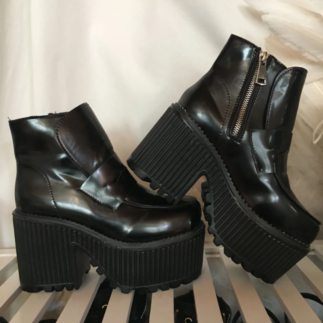 Skitsnygga skor!!! Köpta i Japan!!! Vill inte skiljas från de egentligen men kollar intresset nu 😭Aldrig använda pga för små💔 Passar en liten 36a eller en 35a nog. De är lätta och sköna att gå i (ej tunga). Fake läder. Har en riktig rejäl ”trakorsula”. 9cm klack + platå så inte så höga egentligen :) Möts helst upp i Stockholm! Men kan skicka om du betalar frakt!